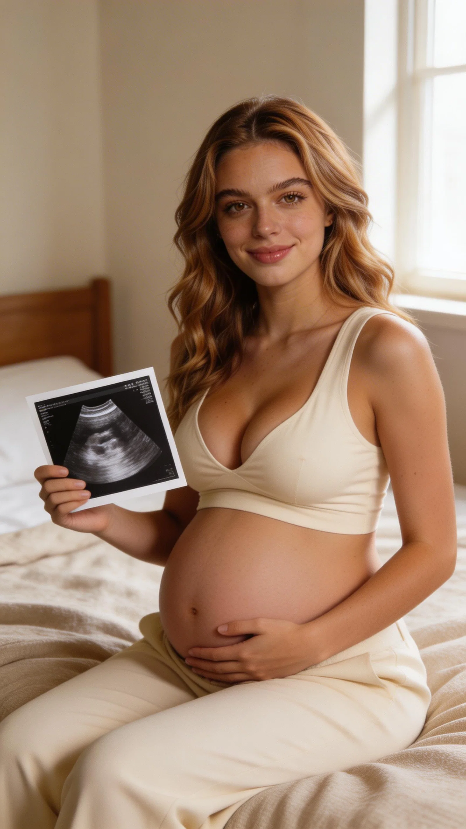 Single photograph of exactly the same person as the reference image(s), consistent identity grounded realistic photograph with high-detail skin texture, visible pores and natural imperfections, female person, 23 years old, light-brown eyes, light-brown hair color, wavy hair style, cream skin Hair color must stay light-brown. Keep hairstyle consistent (wavy). Do not change defining physical features. No wigs. No hats. Face unobscured. Environmental shot. Cozy at-home environmental portrait of the same cream-skinned pregnant woman sitting on a bed with neutral linens, holding a small ultrasound photo in one hand while the other rests on belly. Soft window light, intimate storytelling feel for pregnancy announcement photos, no text, no watermarks, no logos, no overlays