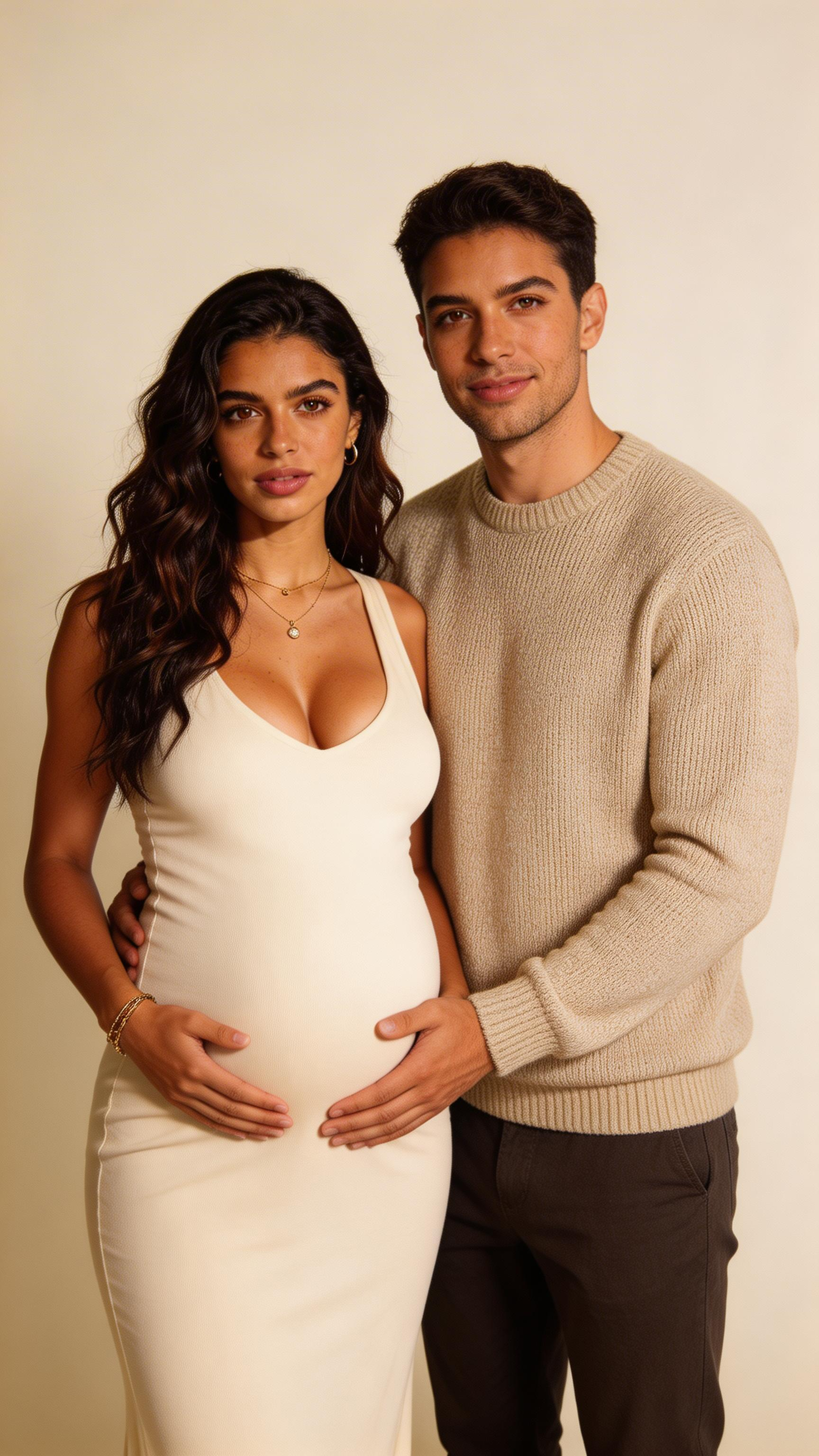 Single photograph of exactly the same person as the reference image(s), consistent identity grounded realistic photograph with high-detail skin texture, visible pores and natural imperfections, female person, 27 years old, brown eyes, dark-brown hair color, wavy hair style, olive skin Hair color must stay dark-brown. Keep hairstyle consistent (wavy). Do not change defining physical features. No wigs. No hats. Face unobscured. Environmental shot. Romantic couple maternity portrait featuring the same woman with her partner, standing close in a minimalist studio. She wears a cream dress; partner wears a neutral sweater. Both smiling softly, hands together on belly, soft even lighting, clean background for timeless look; no captions, no writing; no text, no watermarks, no logos, no overlays