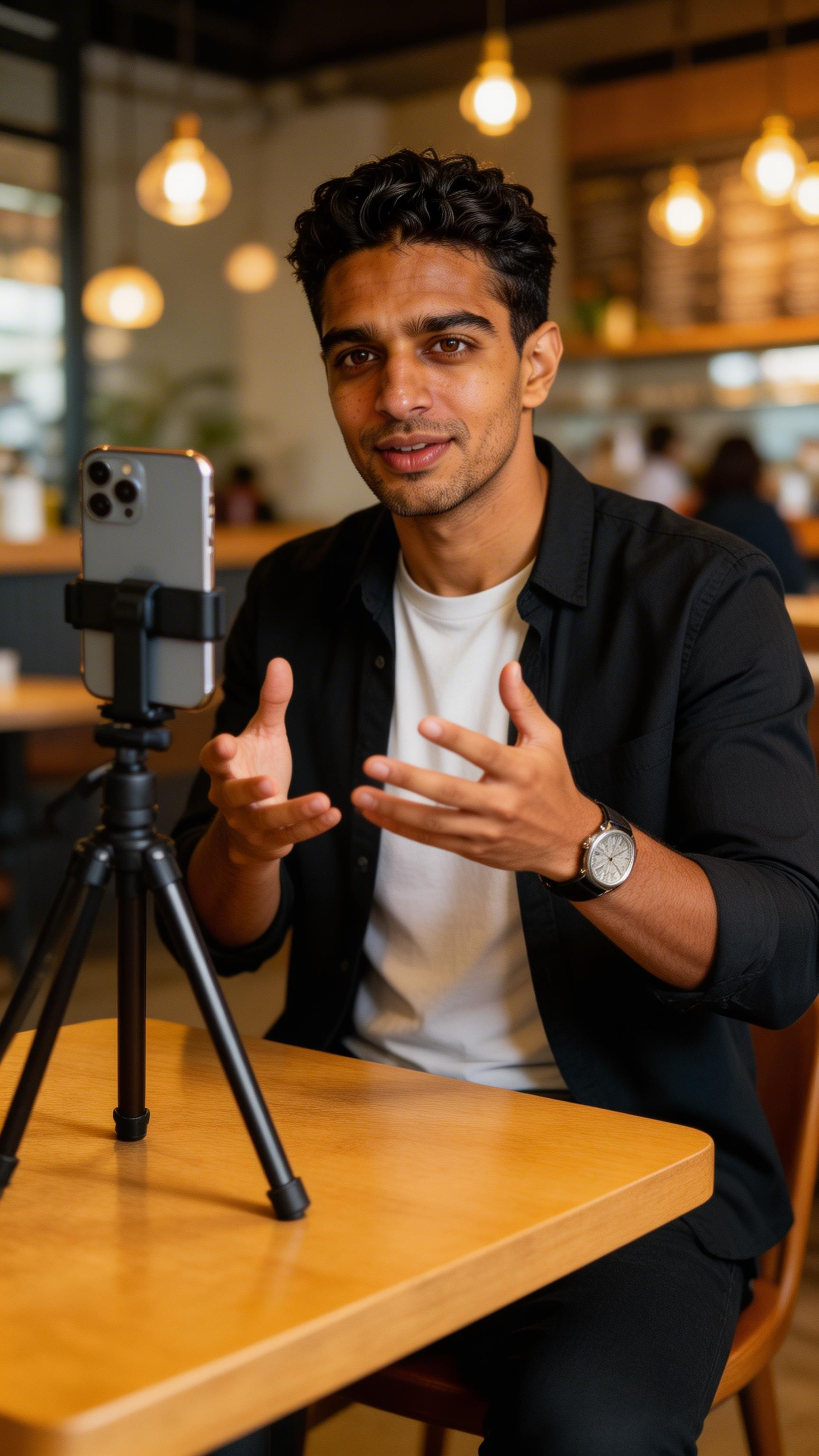 Single photograph of exactly the same person as the reference image(s), consistent identity grounded realistic photograph with high-detail skin texture, visible pores and natural imperfections, male person, 32 years old, dark-brown eyes, black hair color, textured hair style, caramel skin Hair color must stay black. Keep hairstyle consistent (textured). Do not change defining physical features. No wigs. No hats. Face unobscured. Environmental shot. Environmental portrait of the same man in a café filming a “hot take” clip on a tabletop tripod, leaning forward with animated hands. Outfit: button-down over tee, watch. Background: warm coffee shop bokeh, natural light with soft fill, documentary lifestyle style. no captions, no writing, no text, no watermarks, no logos, no overlays