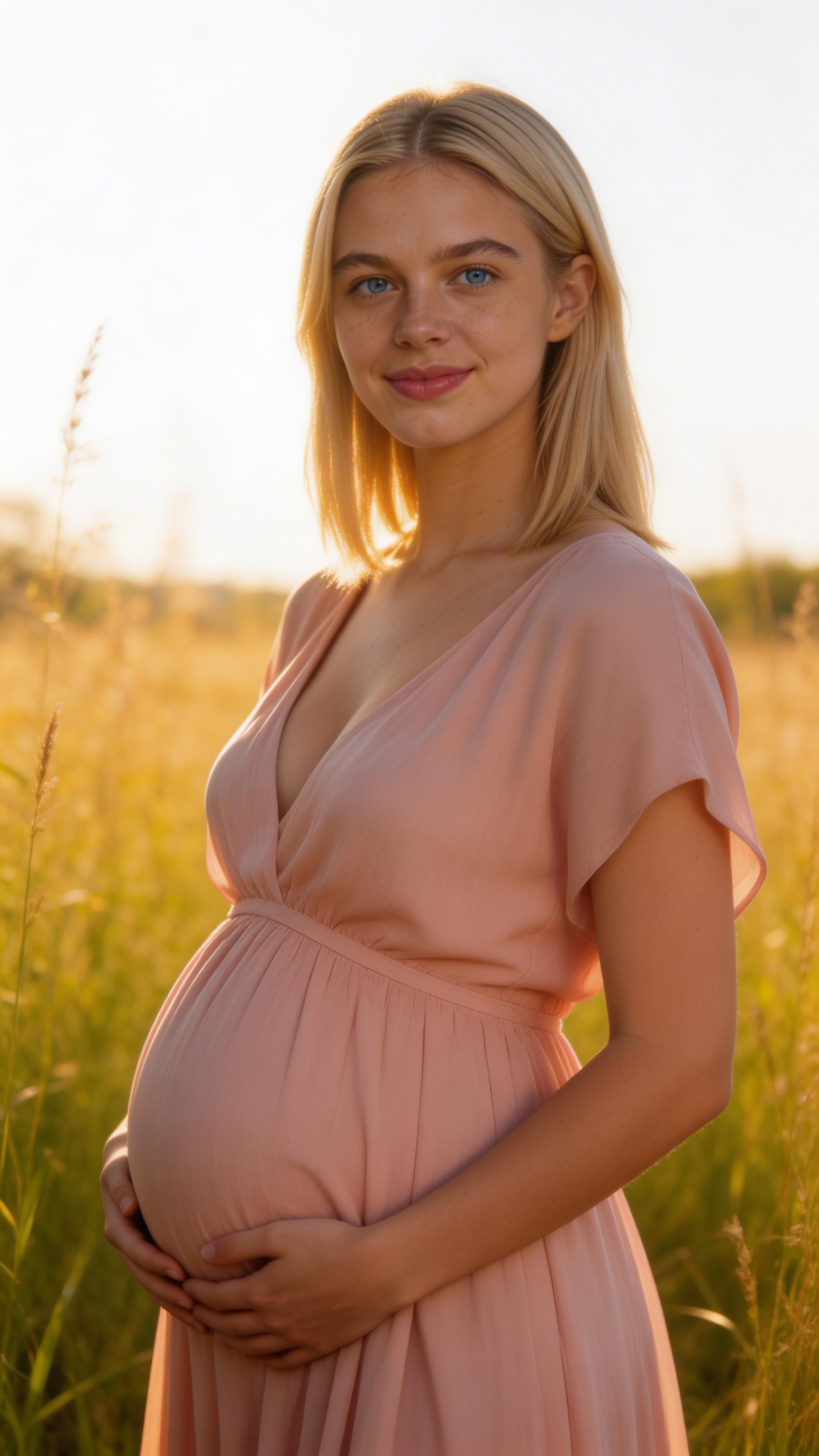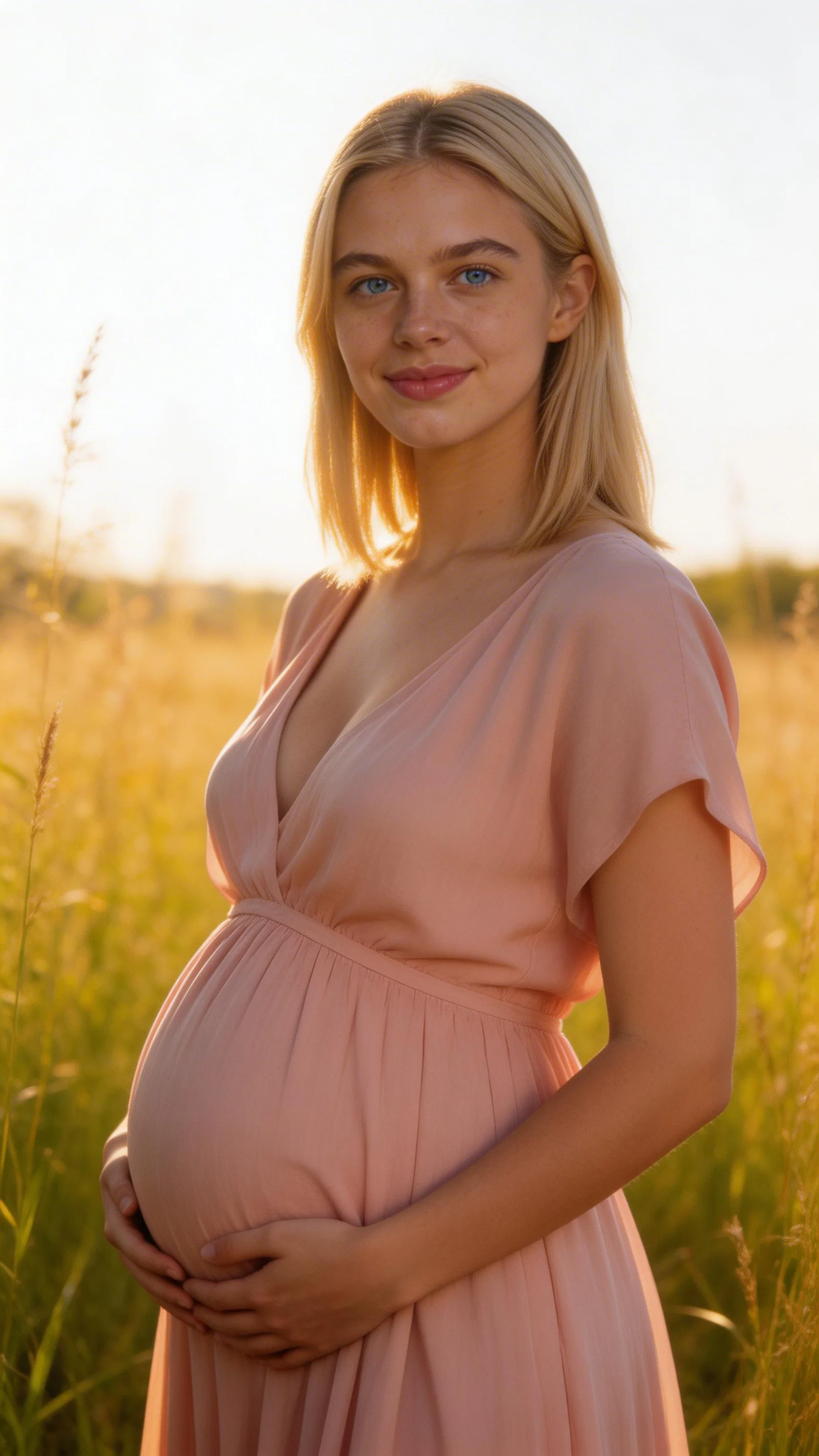 Single photograph of exactly the same person as the reference image(s), consistent identity grounded realistic photograph with high-detail skin texture, visible pores and natural imperfections, female person, 24 years old, light-blue eyes, blonde hair color, straight hair style, ivory skin Hair color must stay blonde. Keep hairstyle consistent (straight). Do not change defining physical features. No wigs. No hats. Face unobscured. Environmental shot. Outdoor golden hour maternity photo of the same woman in a flowing blush gown, three-quarter body, standing in tall grass. Warm sunlight rim light, dreamy bokeh, serene expression, hands framing belly, romantic lifestyle feel; no captions, no writing; no text, no watermarks, no logos, no overlays