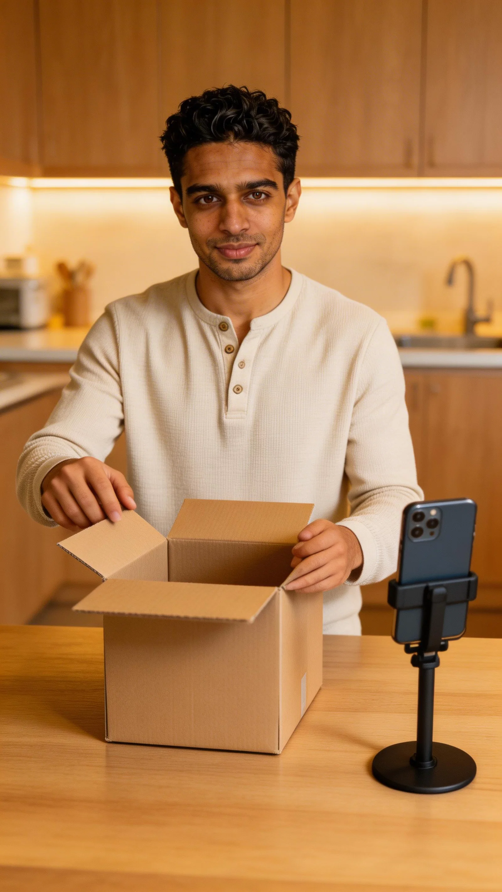 Single photograph of exactly the same person as the reference image(s), consistent identity grounded realistic photograph with high-detail skin texture, visible pores and natural imperfections, male person, 32 years old, dark-brown eyes, black hair color, textured hair style, caramel skin Hair color must stay black. Keep hairstyle consistent (textured). Do not change defining physical features. No wigs. No hats. Face unobscured. Half-body shot. Half-body lifestyle shot of the same man filming an unboxing at a kitchen island, hands opening a box toward a phone camera. Outfit: casual henley, clean grooming. Warm kitchen lighting, polished lifestyle photography. no captions, no writing, no text, no watermarks, no logos, no overlays