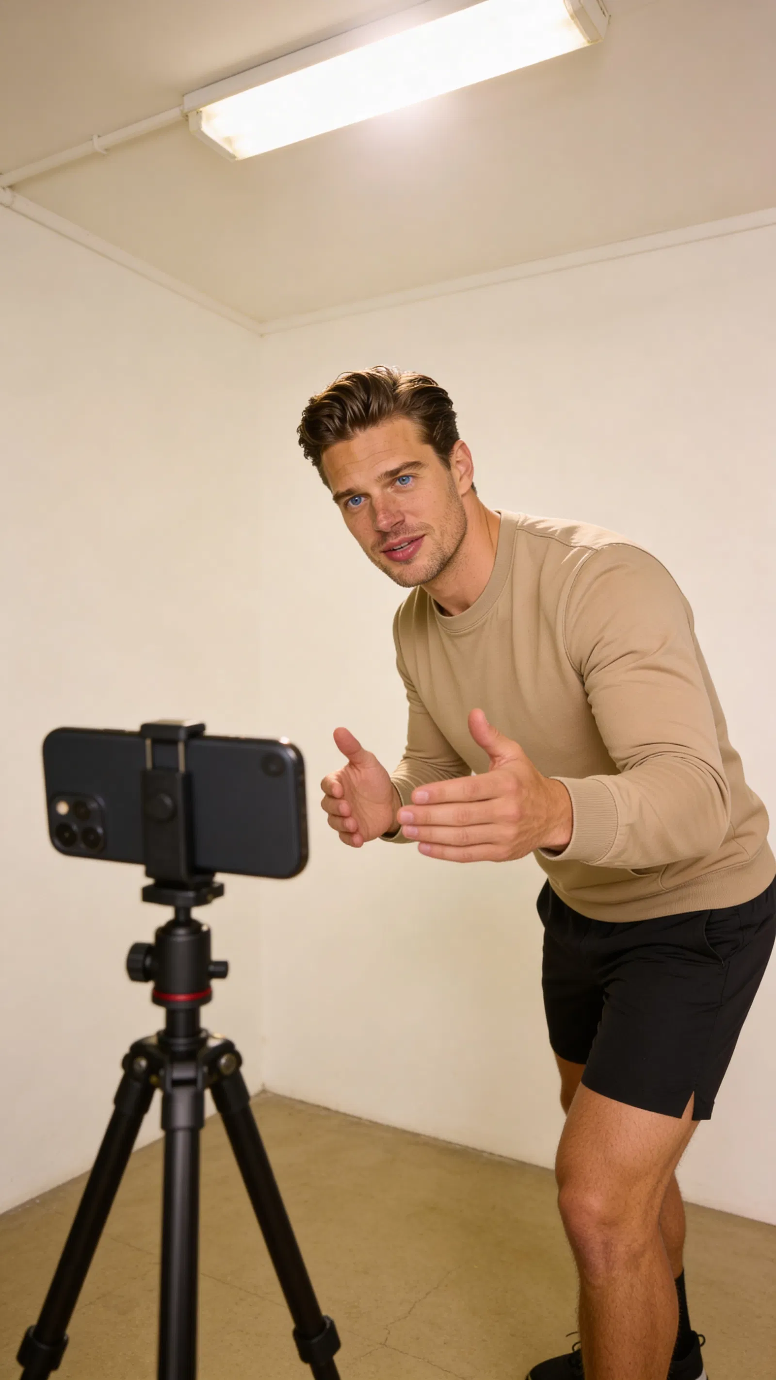 Single photograph of exactly the same person as the reference image(s), consistent identity realistic photograph, male person, 34 years old, blue eyes, dark-brown hair color, side-part hair style, beige skin Hair color must stay dark-brown. Keep hairstyle consistent (side-part). Do not change defining physical features. No wigs. No hats. Face unobscured. Half-body shot. Caucasian/White man, half-body in a gym corner, demonstrating a simple exercise beside a phone on tripod for an IG Reels clip. Expression: focused and encouraging. Outfit: clean athletic set. Bright overhead lights with controlled contrast, professional sports lifestyle photography, no text, no watermarks, no logos, no overlays