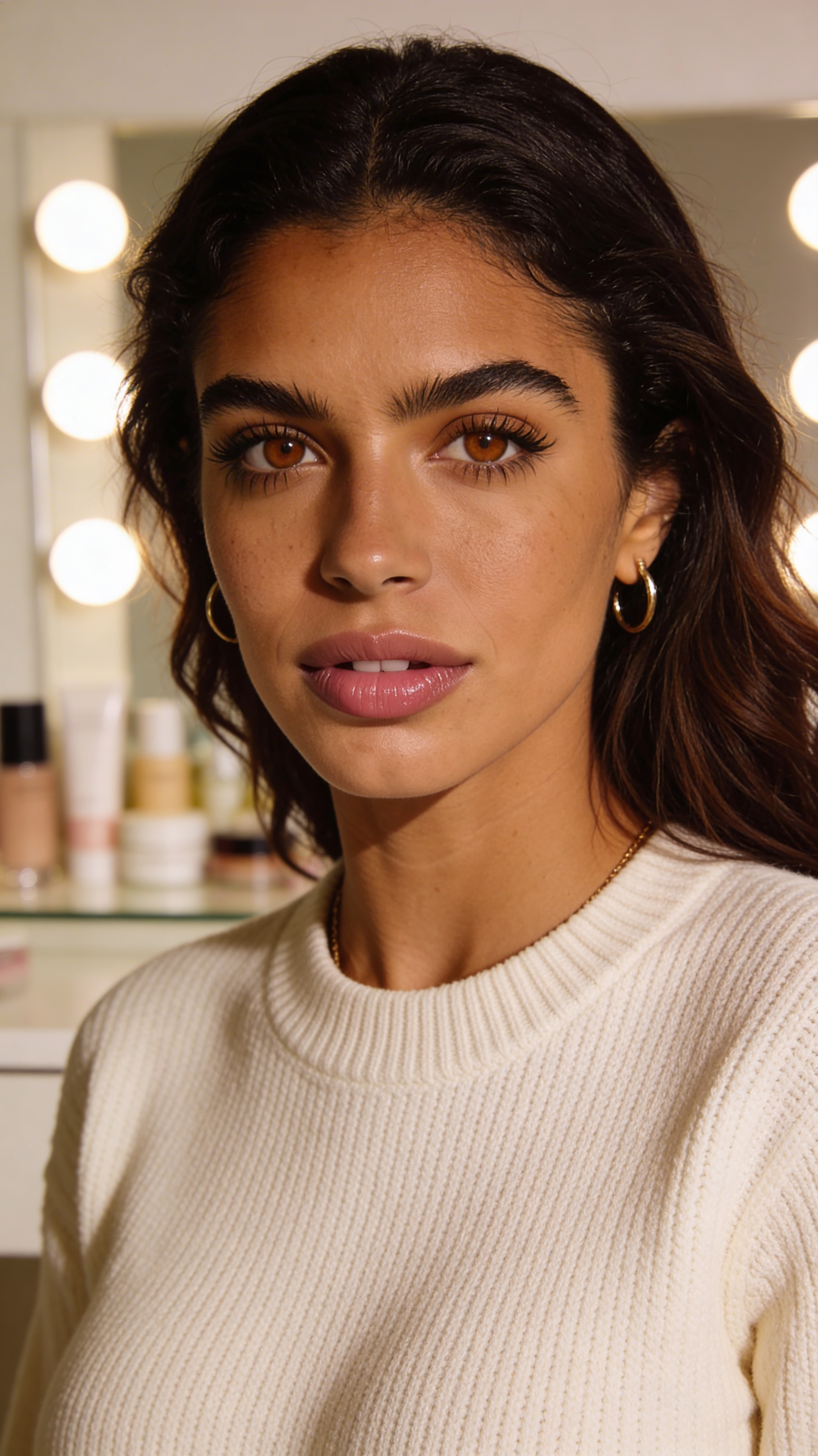 Single photograph of exactly the same person as the reference image(s), consistent identity realistic photograph, female person, 27 years old, brown eyes, dark-brown hair color, wavy hair style, olive skin Hair color must stay dark-brown. Keep hairstyle consistent (wavy). Do not change defining physical features. No wigs. No hats. Face unobscured. Headshot shot. Middle Eastern/Mediterranean woman, 27, slim build, olive skin, long dark-brown wavy hair, warm brown eyes. Clean beauty headshot with soft ring-light catchlights, natural makeup, wearing a cream knit top. Background: tidy vanity with skincare props softly blurred, like a polished IG profile photo. Studio lighting, high-end portrait look, no text, no watermarks, no logos, no overlays