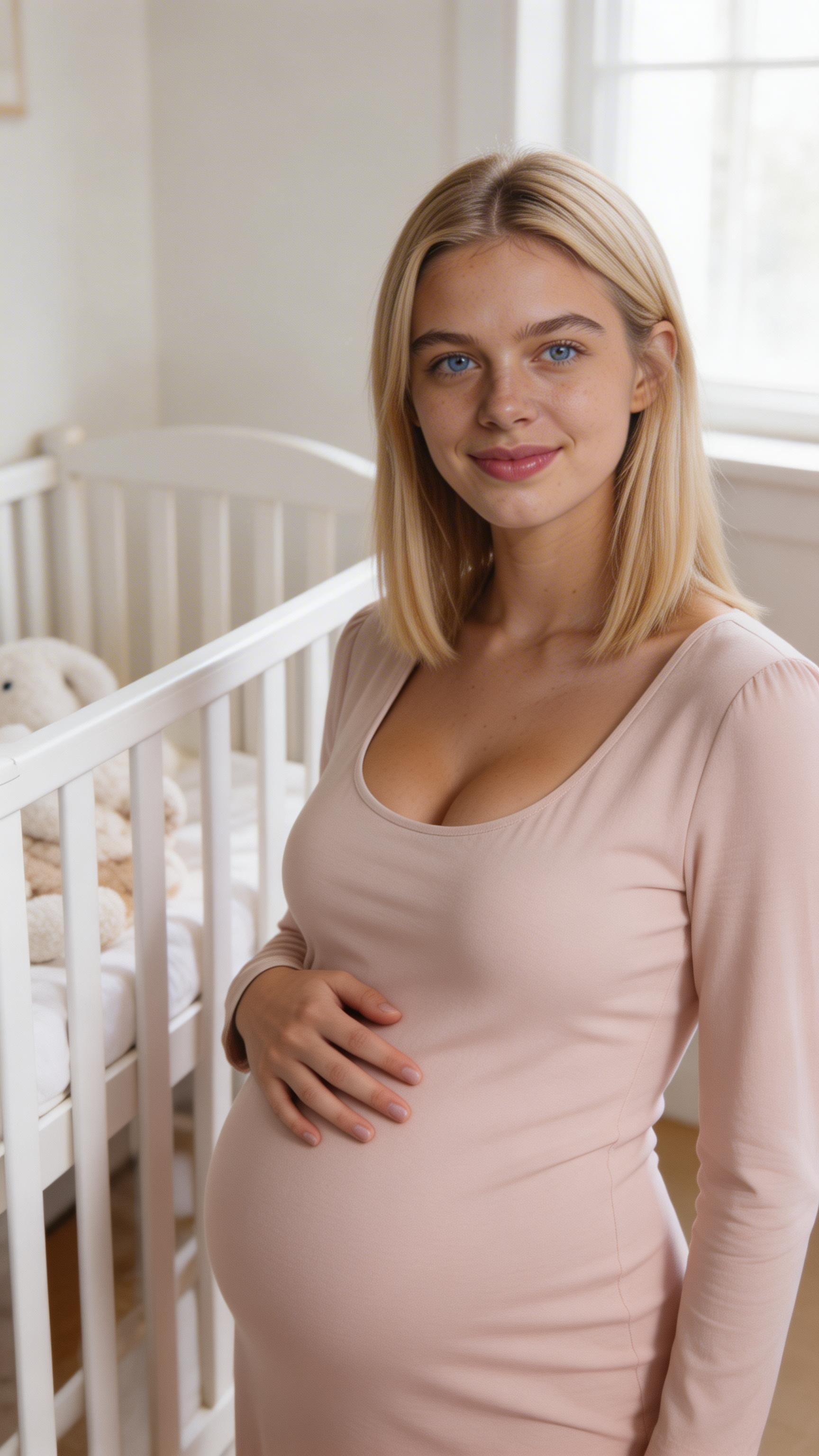 Single photograph of exactly the same person as the reference image(s), consistent identity grounded realistic photograph with high-detail skin texture, visible pores and natural imperfections, female person, 24 years old, light-blue eyes, blonde hair color, straight hair style, ivory skin Hair color must stay blonde. Keep hairstyle consistent (straight). Do not change defining physical features. No wigs. No hats. Face unobscured. Half-body shot. Nursery lifestyle maternity photo of the same woman standing beside a crib, wearing a soft pastel dress, relaxed smile. Natural window light, airy neutral decor, half-body composition with hand on belly, warm and intimate mood; no captions, no writing; no text, no watermarks, no logos, no overlays