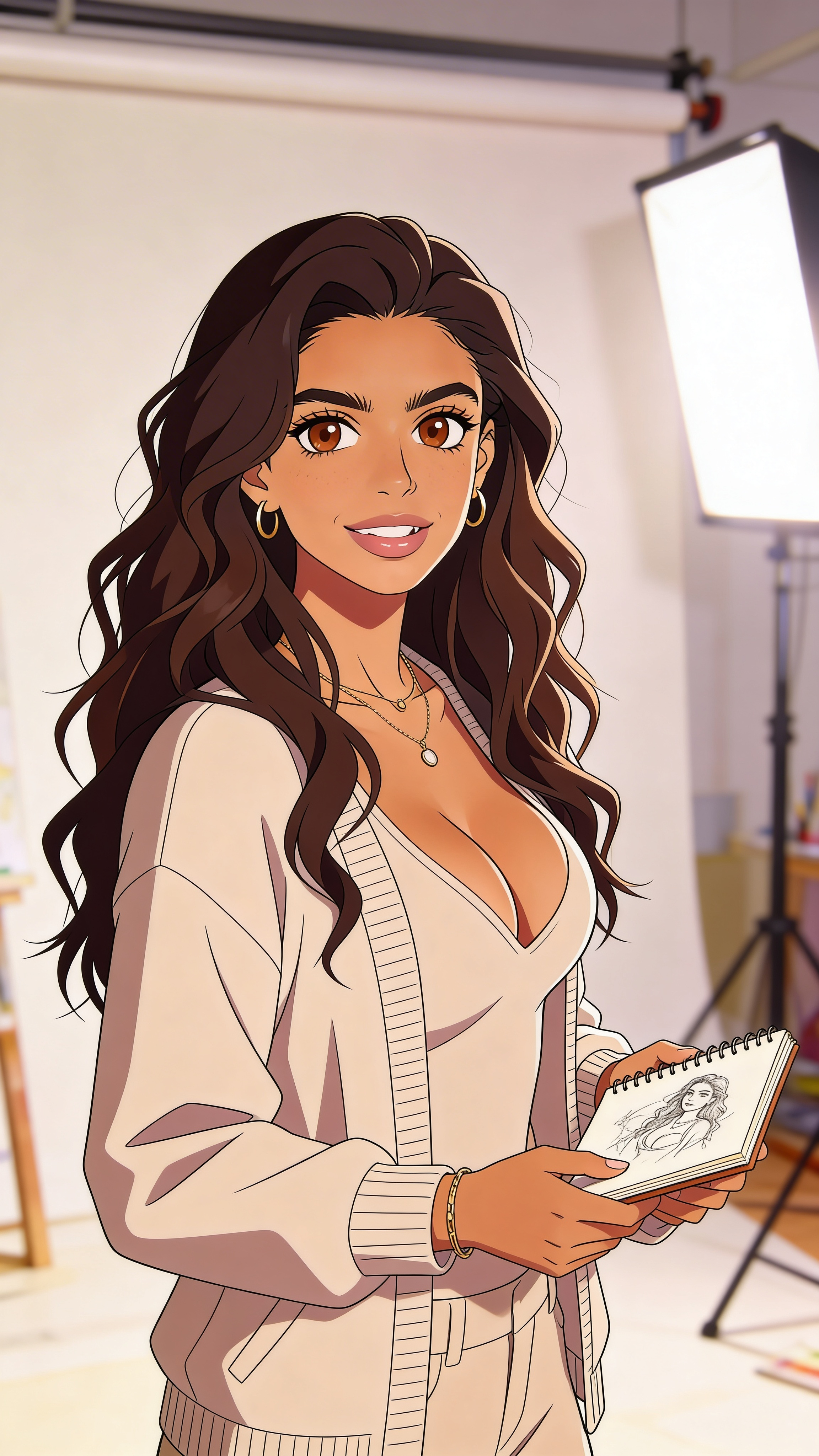 Single photograph of exactly the same person as the reference image(s), consistent identity realistic photograph, female person, 27 years old, brown eyes, dark-brown hair color, wavy hair style, olive skin Hair color must stay dark-brown. Keep hairstyle consistent (wavy). Do not change defining physical features. No wigs. No hats. Face unobscured. Half-body shot. Anime-style profile picture illustration of the same olive-skinned young woman with dark-brown long wavy hair, half-body framing, friendly smile while holding a small sketchbook. Creative studio background softly blurred, bright softbox lighting for clean anime tones. Wearing a casual cardigan, clear eyes and neat hair detail for profile-picture readability, no captions, no writing, no text, no watermarks, no logos, no overlays