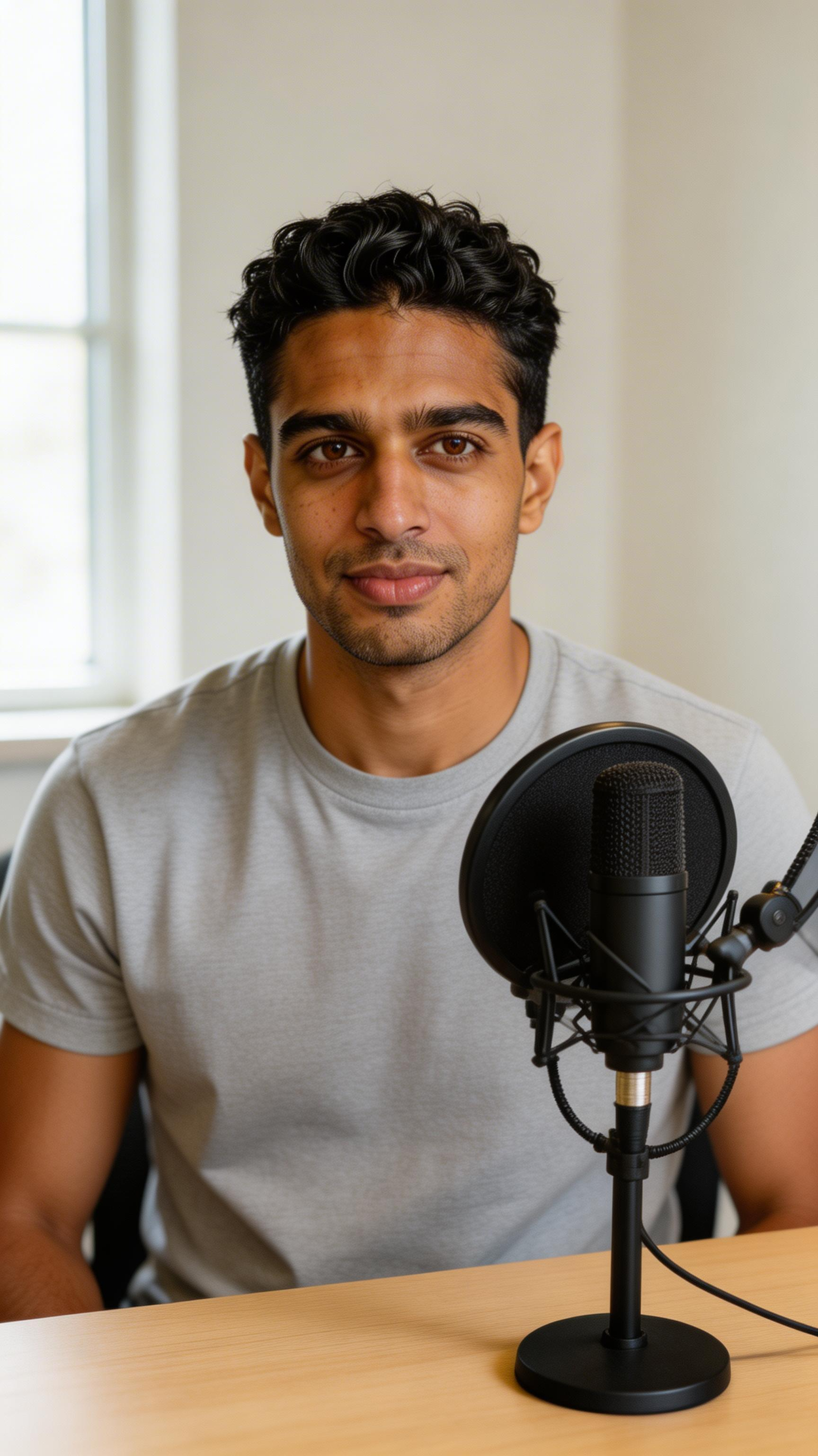 Single photograph of exactly the same person as the reference image(s), consistent identity grounded realistic photograph with high-detail skin texture, visible pores and natural imperfections, male person, 32 years old, dark-brown eyes, black hair color, textured hair style, caramel skin Hair color must stay black. Keep hairstyle consistent (textured). Do not change defining physical features. No wigs. No hats. Face unobscured. Half-body shot. Half-body shot of the same man at a clean desk setup with microphone, recording a “3 tips in 15 seconds” tutorial. Expression: focused, coach-like. Background: minimalist office, soft daylight, crisp professional creator look. no captions, no writing, no text, no watermarks, no logos, no overlays