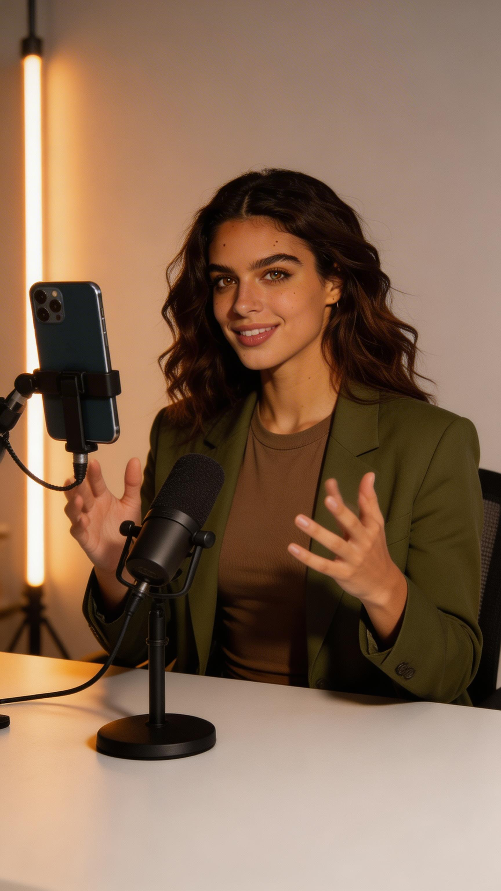 Single photograph of exactly the same person as the reference image(s), consistent identity grounded realistic photograph with high-detail skin texture, visible pores and natural imperfections, female person, 24 years old, hazel eyes, dark-brown hair color, wavy hair style, olive skin Hair color must stay dark-brown. Keep hairstyle consistent (wavy). Do not change defining physical features. No wigs. No hats. Face unobscured. Half-body shot. Half-body shot of the same woman seated at a desk with a small microphone and phone stand, wearing a blazer for a “tips in 30 seconds” format. Expression: clear and persuasive, hands mid-gesture. Background: tidy creator desk setup, warm key light with subtle neon rim. no captions, no writing, no text, no watermarks, no logos, no overlays