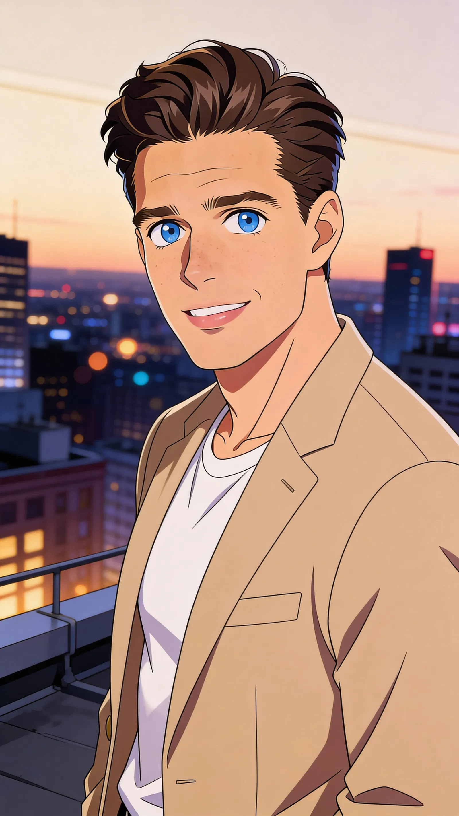 Single photograph of exactly the same person as the reference image(s), consistent identity realistic photograph, male person, 34 years old, blue eyes, dark-brown hair color, side-part hair style, beige skin Hair color must stay dark-brown. Keep hairstyle consistent (side-part). Do not change defining physical features. No wigs. No hats. Face unobscured. Environmental shot. Anime-style profile picture illustration of the same beige-skinned man with short side-part dark-brown hair and blue eyes, 3/4 body framing, standing on a rooftop with city bokeh, confident smile. Evening cinematic lighting with key light and rim for vivid anime shading. Wearing a tailored blazer over a t-shirt, profile-picture centered composition, no captions, no writing, no text, no watermarks, no logos, no overlays