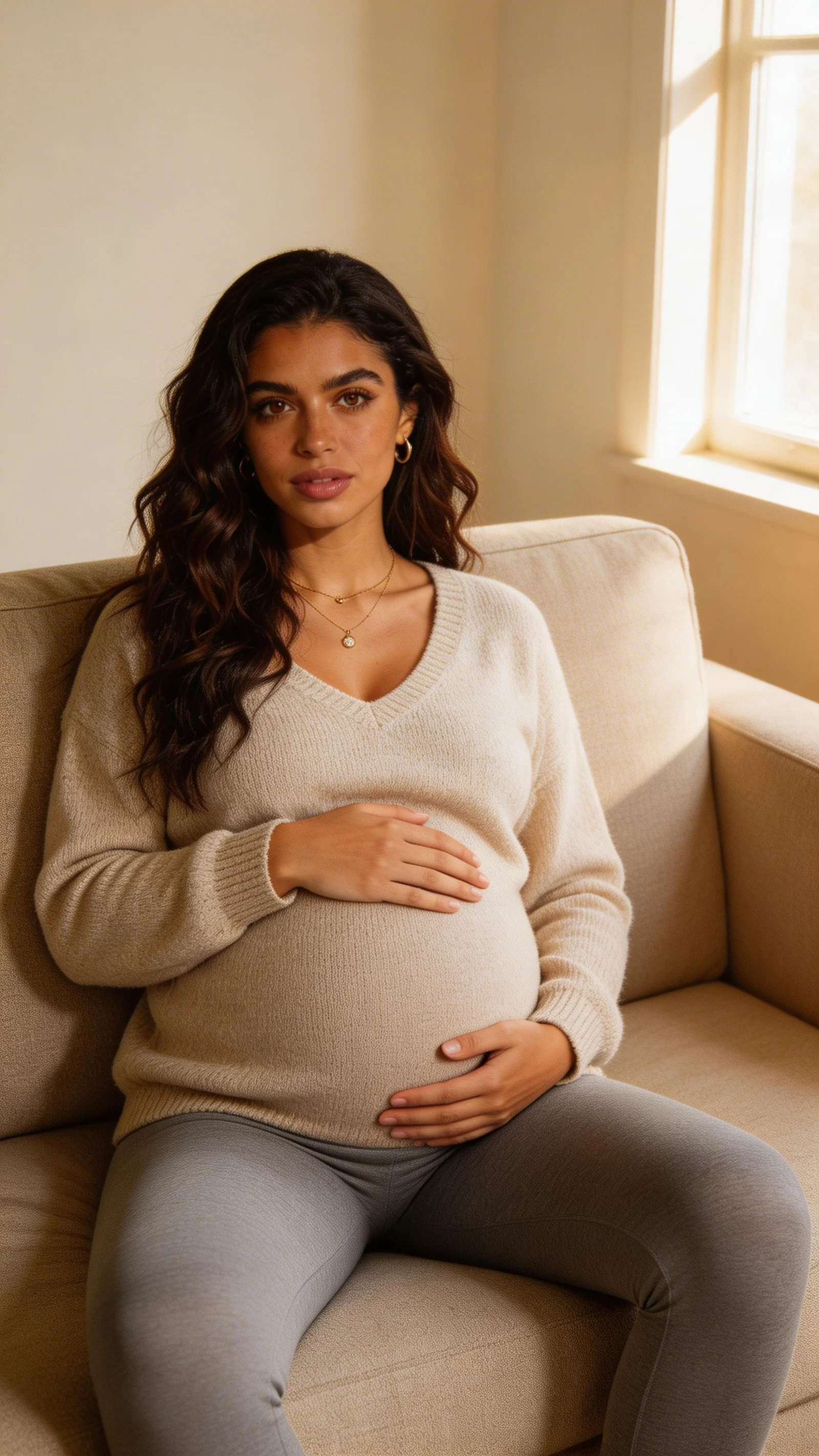 Single photograph of exactly the same person as the reference image(s), consistent identity grounded realistic photograph with high-detail skin texture, visible pores and natural imperfections, female person, 27 years old, brown eyes, dark-brown hair color, wavy hair style, olive skin Hair color must stay dark-brown. Keep hairstyle consistent (wavy). Do not change defining physical features. No wigs. No hats. Face unobscured. Environmental shot. Three-quarter body lifestyle portrait of the same olive-skinned pregnant woman at home by a sunlit window, seated on a neutral couch with relaxed posture, hands resting on belly. She wears a cozy knit maternity sweater and leggings, warm natural window light, minimal decor, authentic “maternity photos from home” feel, no text, no watermarks, no logos, no overlays