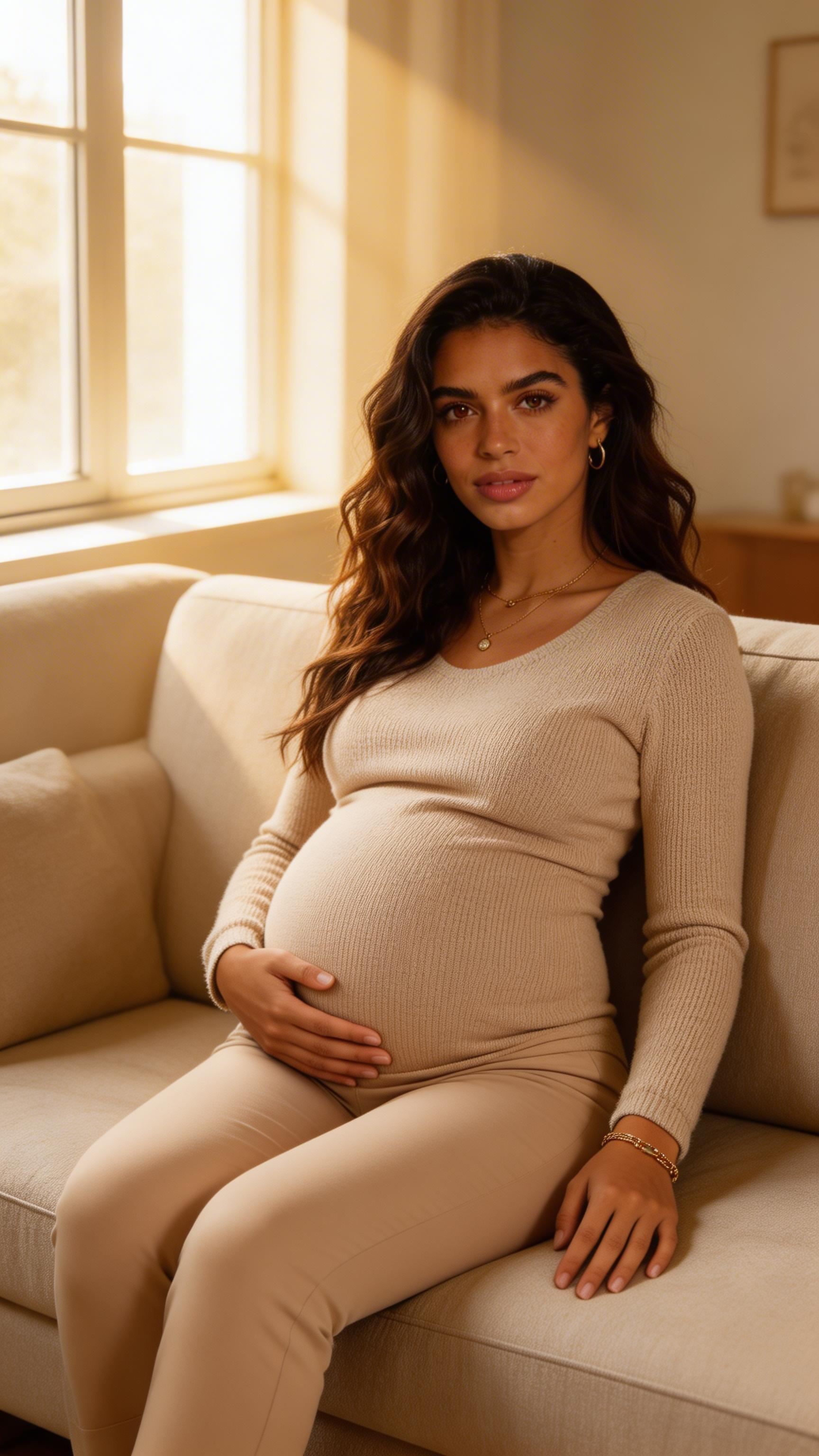 Single photograph of exactly the same person as the reference image(s), consistent identity grounded realistic photograph with high-detail skin texture, visible pores and natural imperfections, female person, 27 years old, brown eyes, dark-brown hair color, wavy hair style, olive skin Hair color must stay dark-brown. Keep hairstyle consistent (wavy). Do not change defining physical features. No wigs. No hats. Face unobscured. Environmental shot. Cozy at-home lifestyle maternity photo of the same woman in a soft knit beige lounge set, sitting on a sofa near a window. Calm smile, hand on belly, warm morning light, minimal modern living room background, documentary feel but polished; no captions, no writing; no text, no watermarks, no logos, no overlays