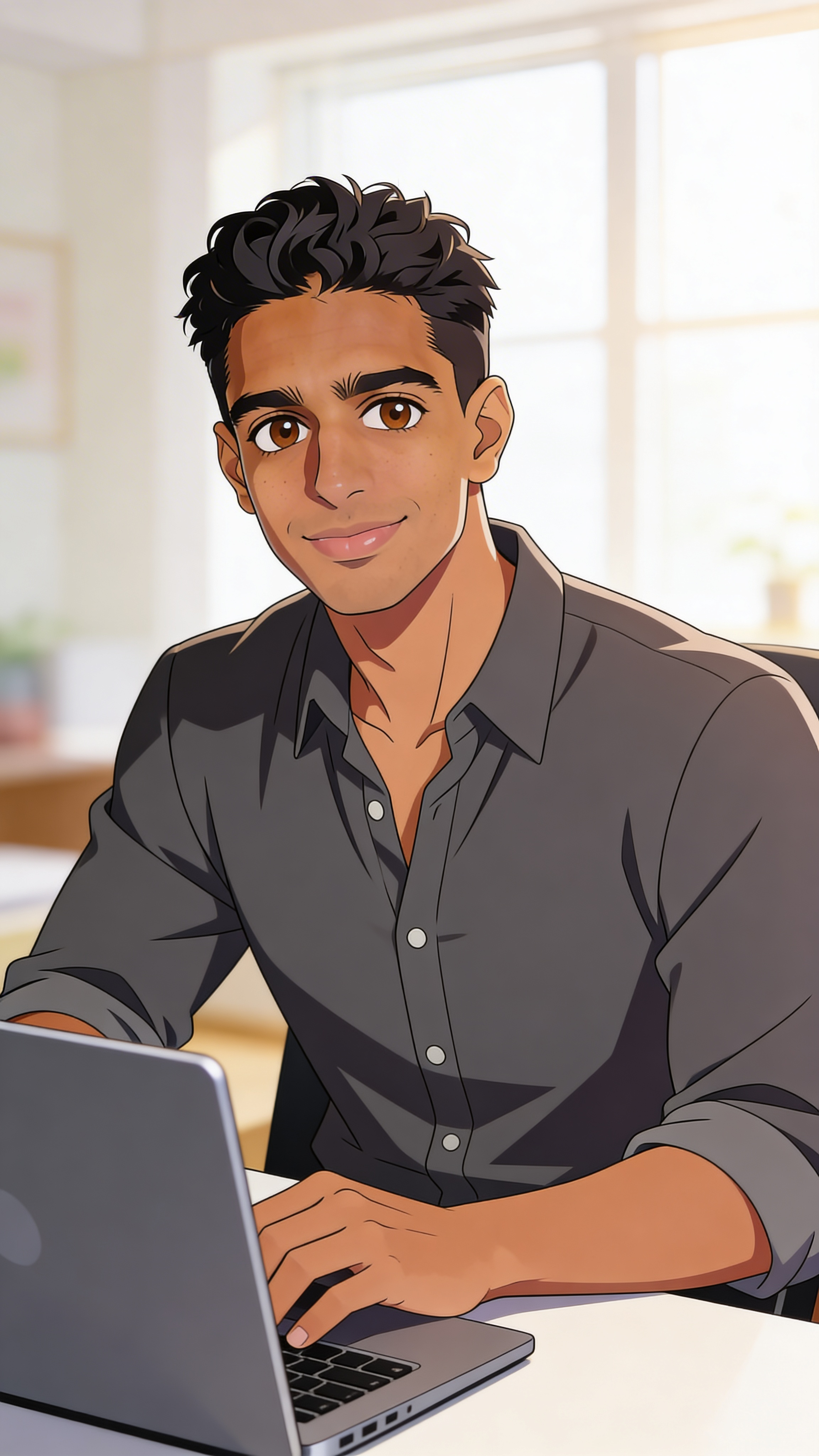 Single photograph of exactly the same person as the reference image(s), consistent identity realistic photograph, male person, 32 years old, dark-brown eyes, black hair color, textured hair style, caramel skin Hair color must stay black. Keep hairstyle consistent (textured). Do not change defining physical features. No wigs. No hats. Face unobscured. Environmental shot. Anime-style profile picture illustration of the same caramel-skinned man with short textured black hair, 3/4 body framing, seated at a desk with a laptop, slight smile. Home office background softly blurred, bright window light and gentle rim for dimensional anime rendering. Wearing a casual button-down, profile-picture centered crop, no captions, no writing, no text, no watermarks, no logos, no overlays