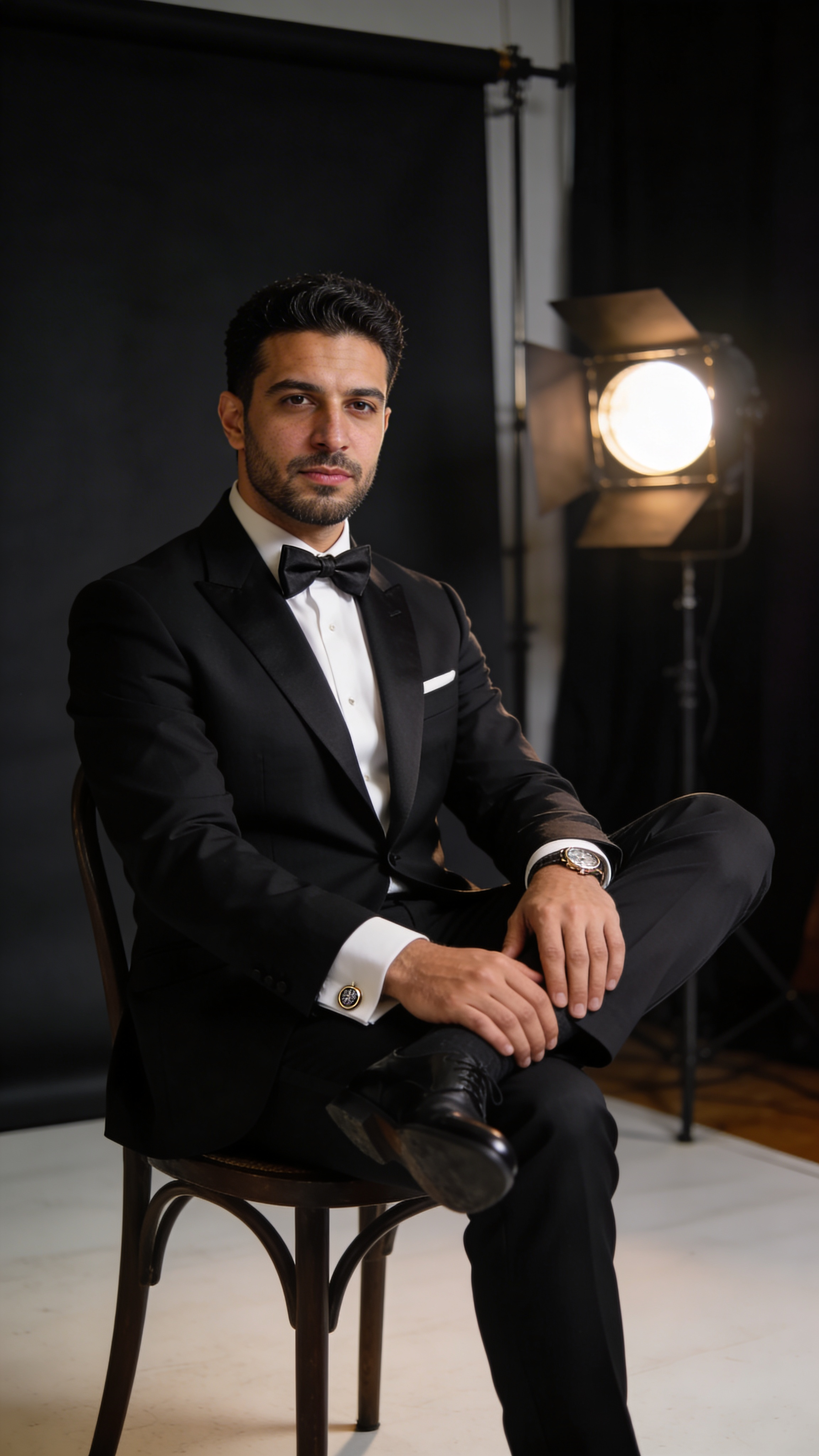 Studio portrait of a Middle Eastern man in a black tuxedo, seated with one ankle resting on opposite knee, calm confident expression. Softbox lighting, dark backdrop, cinematic wedding groom portraits vibe, sharp detail in bow tie and cufflinks, natural retouching. No captions, no writing; no text, no watermarks, no logos, no overlays