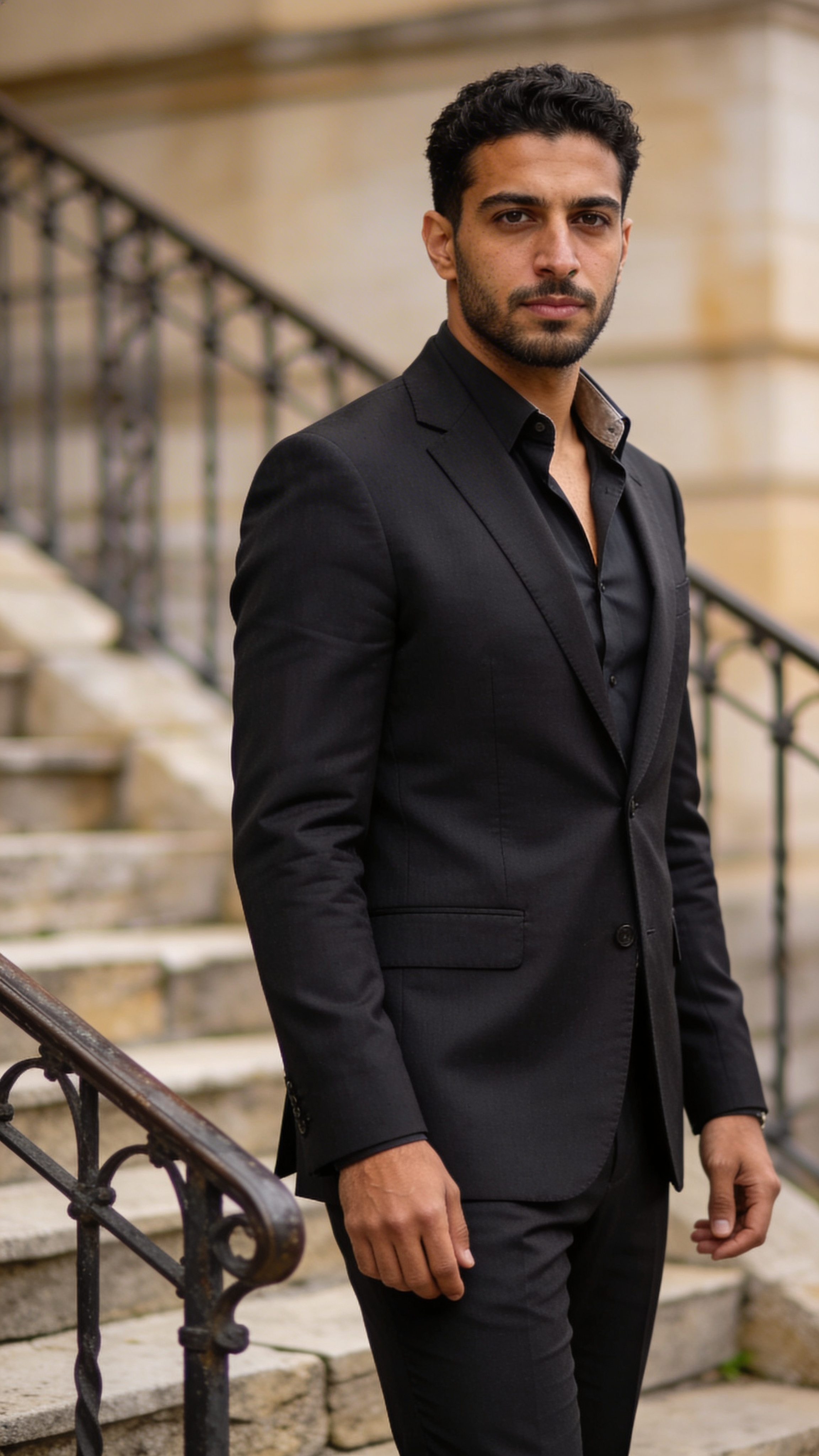 Outdoor environmental portrait of a Middle Eastern man attorney in his early 30s, half-body, standing near stone steps and iron railings. He wears a dark suit with open-collar shirt, confident posture, direct eye contact. Lighting: overcast daylight for soft shadows, crisp detail. Background blurred, no visible signage or building names. No captions, no writing, no text, no watermarks, no logos, no overlays