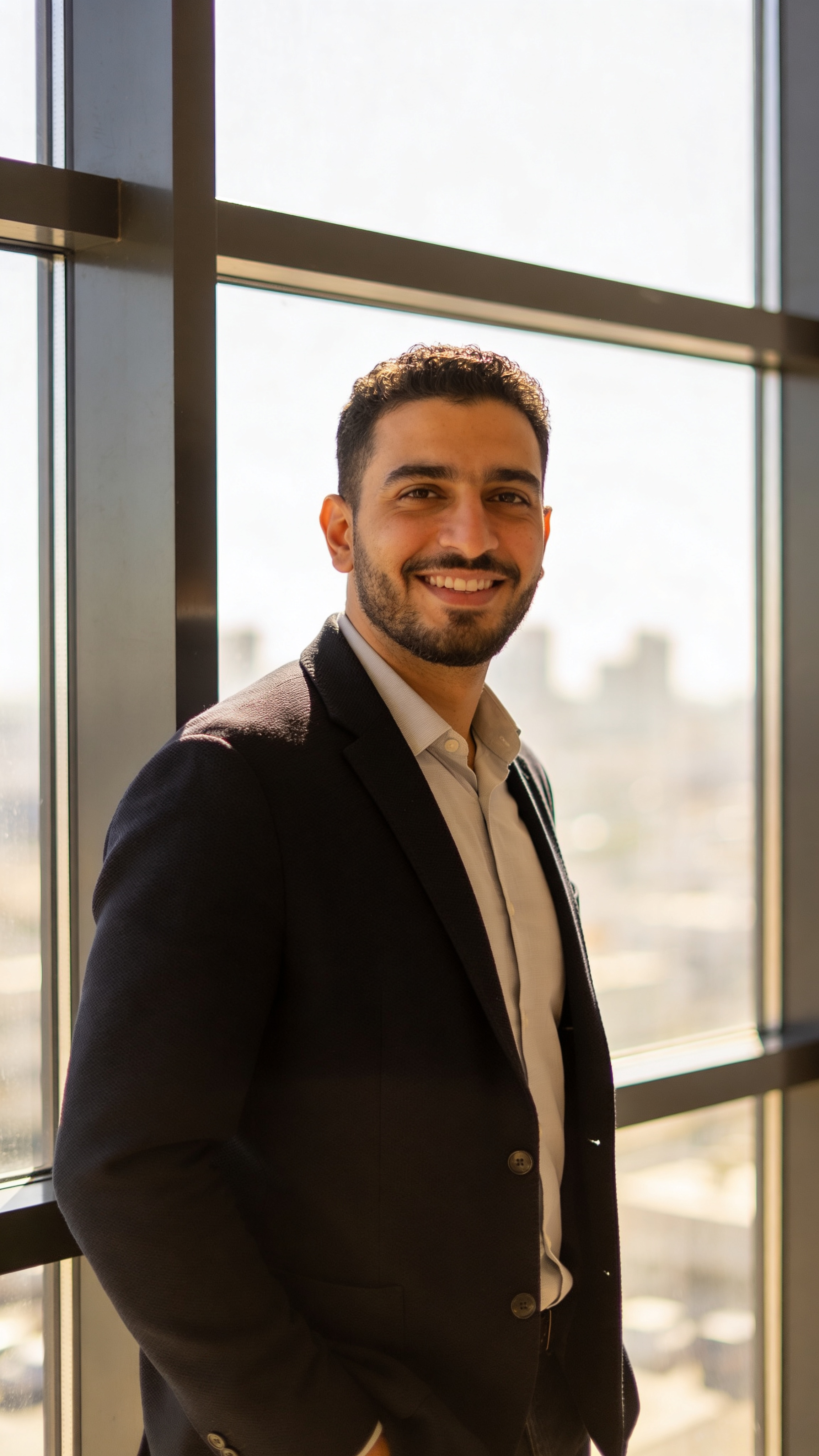 Three-quarter portrait of a Middle Eastern man in his mid-30s wearing a dark blazer and light shirt, standing by a large window with soft city blur behind. The person faces the camera with a warm professional smile and relaxed posture. Natural side light with fill creates flattering contrast, designed for CV photo for job applications. No window signage; no text, no watermarks, no logos, no overlays.