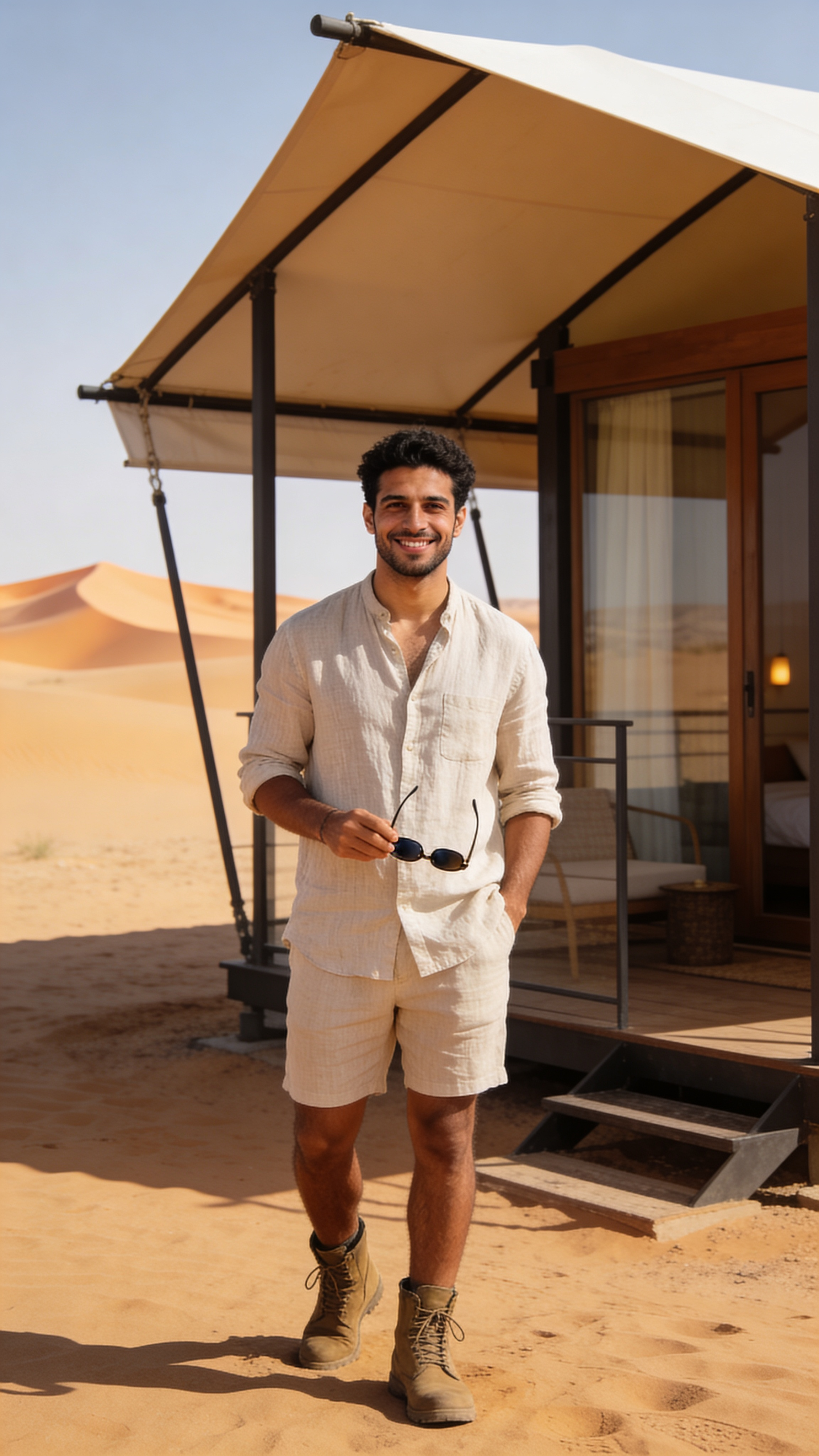 Professional full-body portrait of a Middle Eastern man in his early 30s standing in a bright desert setting near a modern eco-lodge. He wears a light linen shirt, sunglasses in hand, and boots. Expression is confident and friendly. Lighting is clean, high-end editorial with soft shadows; distant dunes create depth, no text, no watermarks, no logos, no overlays, no captions, no writing