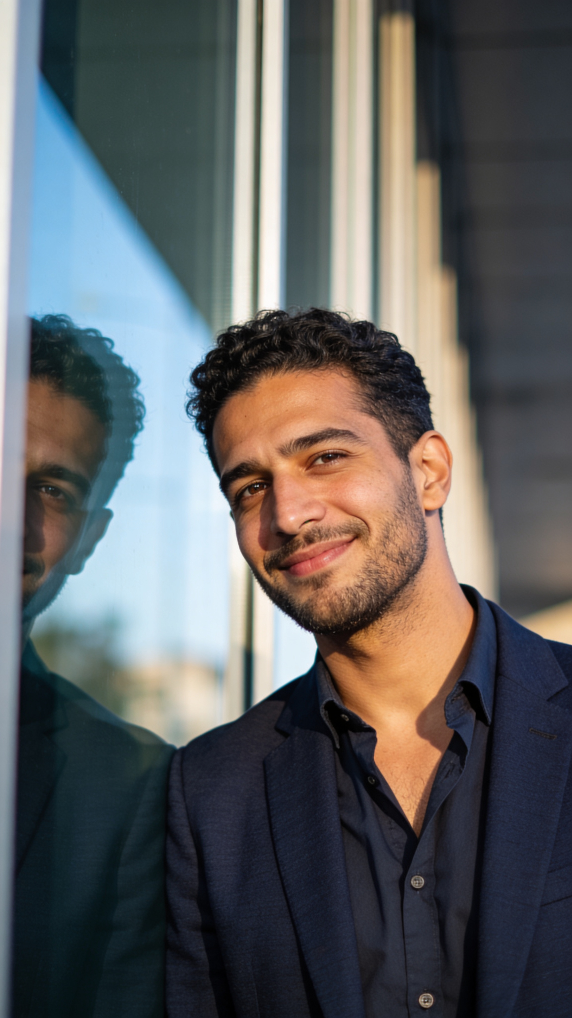 Outdoor portrait of a Middle Eastern man in his mid-30s standing near an architectural glass wall, half-body framing, calm confident smile, wearing a navy blazer and open-collar shirt. Soft daylight with clean reflections, background blur, modern professional vibe. Ensure no captions or writing, no text, no watermarks, no logos, no overlays