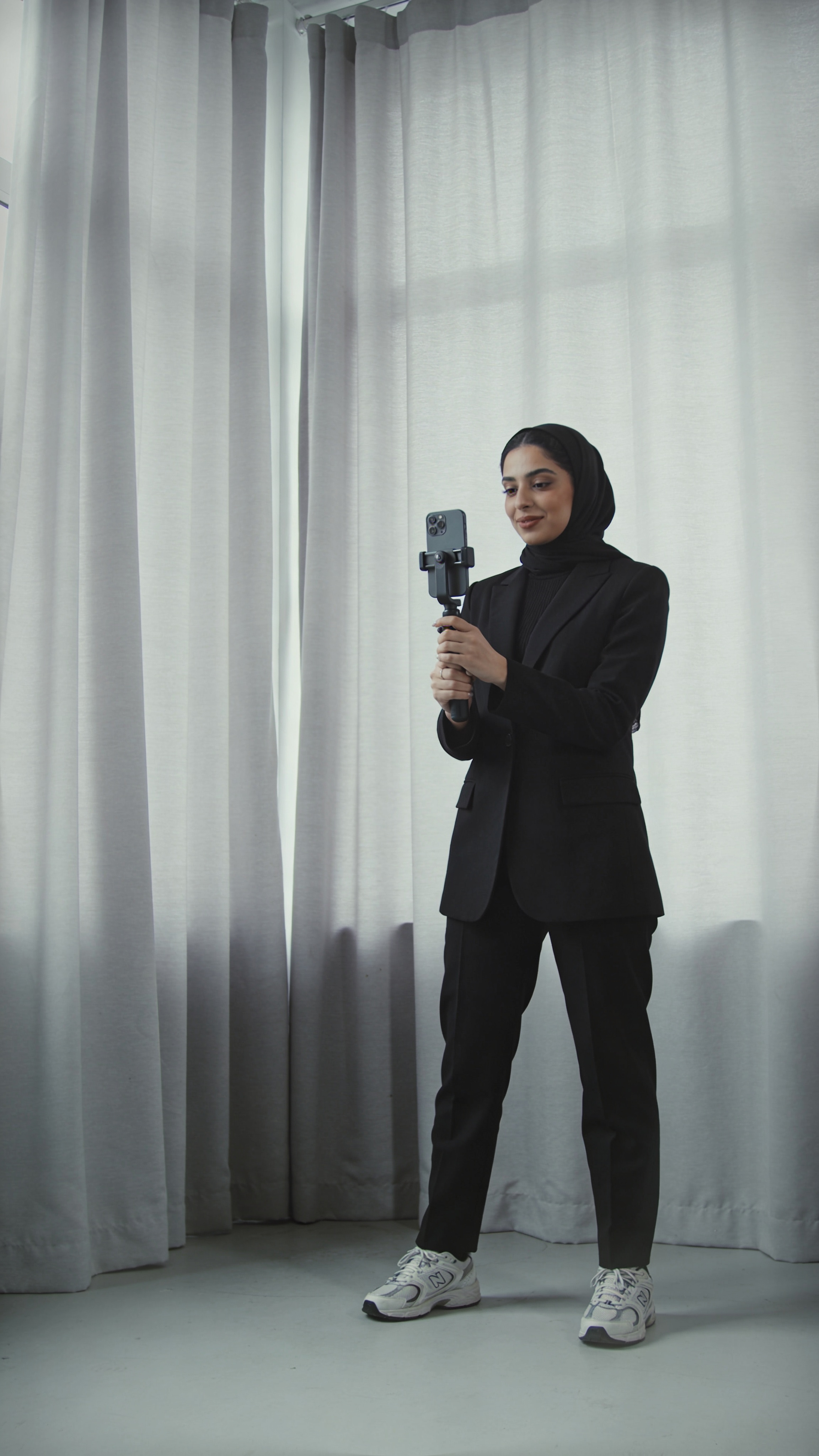 Full-body portrait of a Middle Eastern woman, early 30s, standing in a minimalist studio corner with a soft curtain backdrop, holding a phone on a small grip tripod. Outfit: sleek monochrome suit with sneakers. Expression: confident, creator-ready. Lighting: soft diffused studio light, modern editorial vibe for Instagram content photos online, no captions, no writing, no text, no watermarks, no logos, no overlays