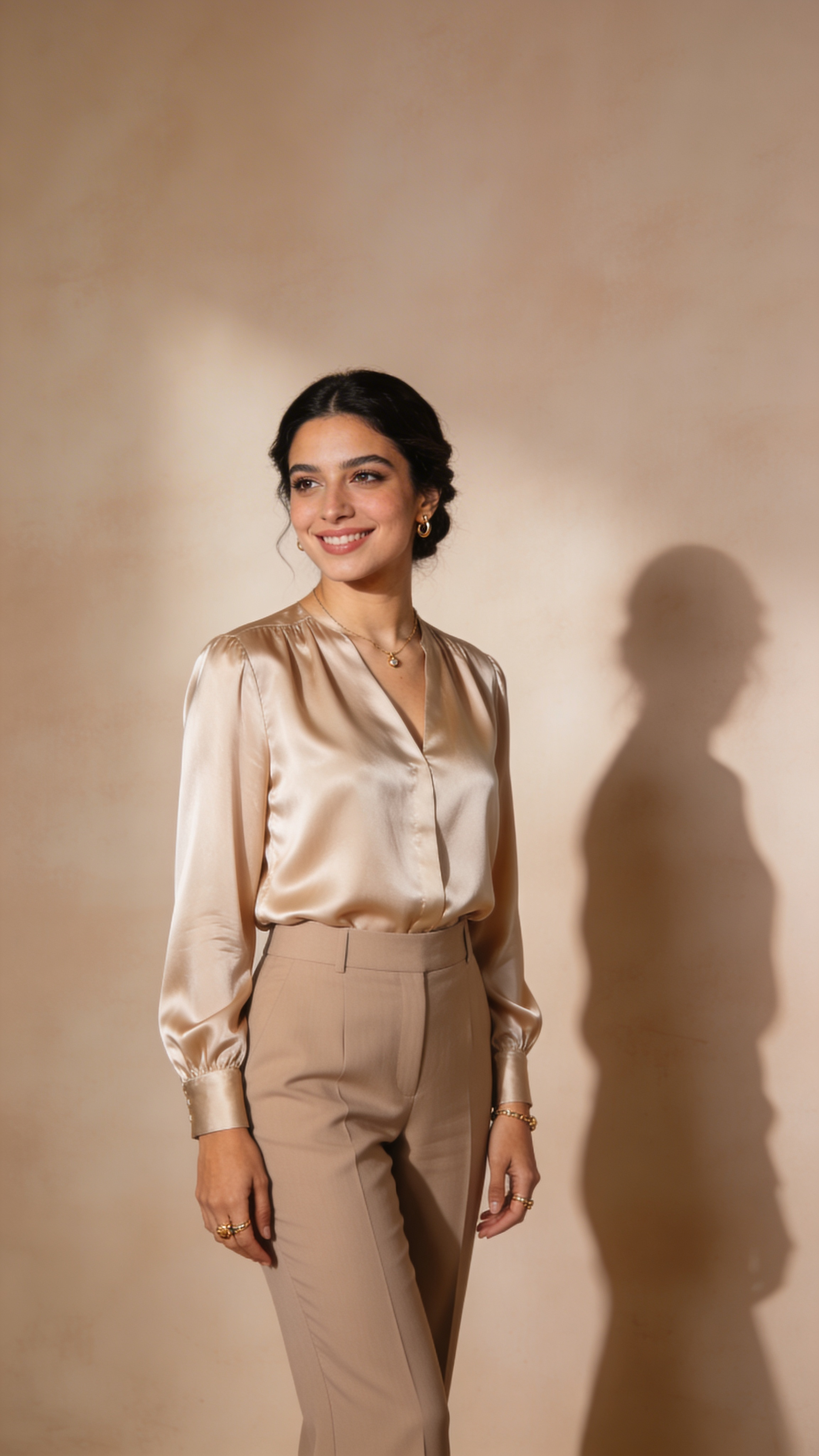 Studio three-quarter portrait of a Middle Eastern woman in her late 20s standing with hands relaxed at sides, confident smile. She wears a modest satin blouse and tailored trousers, subtle jewelry. Background: soft taupe seamless. Directional soft lighting creates gentle contouring for a classic beauty portrait. No captions or writing; no text, no watermarks, no logos, no overlays