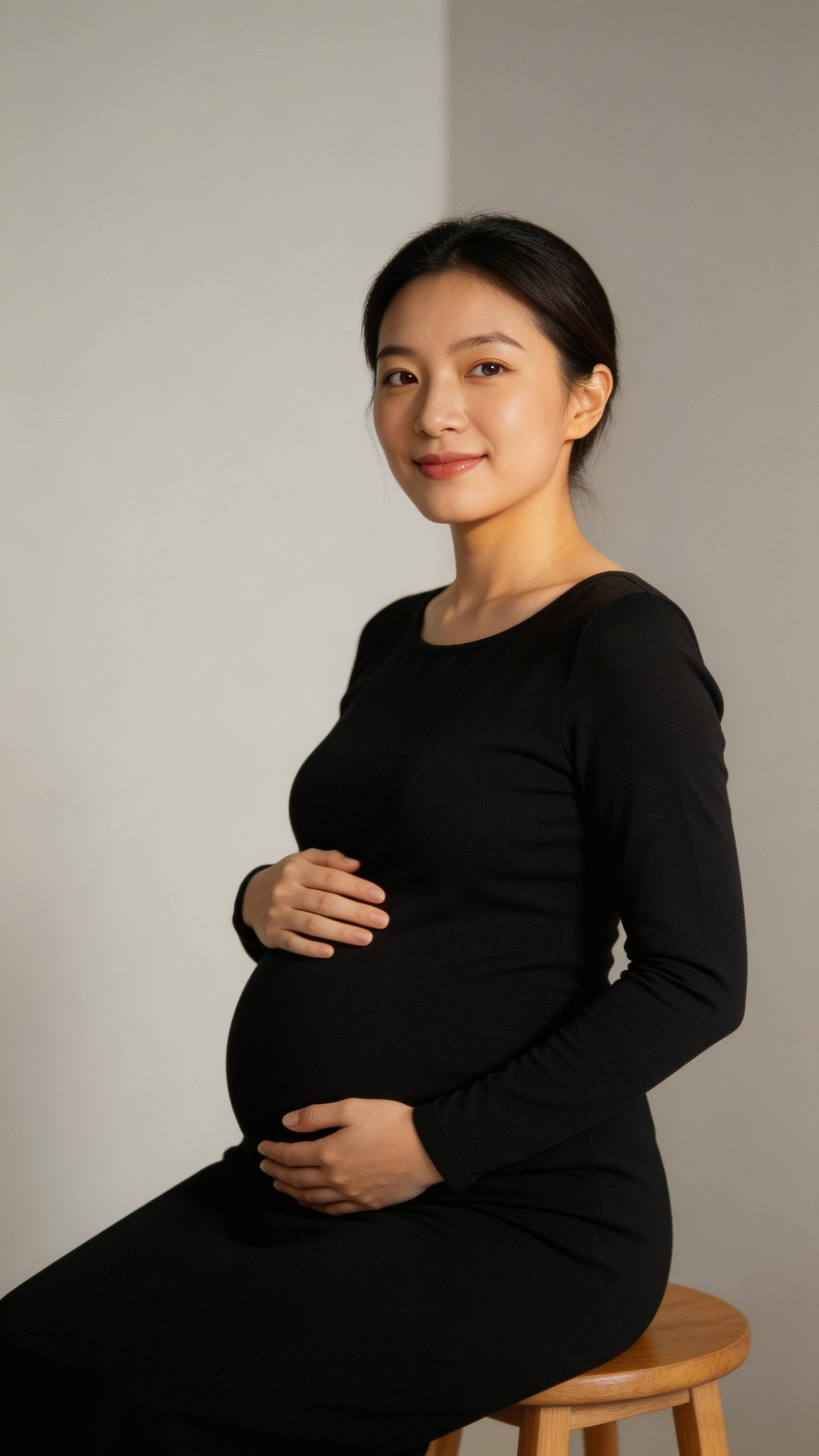 Three-quarter portrait of a pregnant East Asian woman in a simple home studio corner, seated on a stool with confident posture, hands resting on belly. Wearing a fitted black maternity dress, softbox lighting, clean background, no text, no watermarks, no logos, no overlays