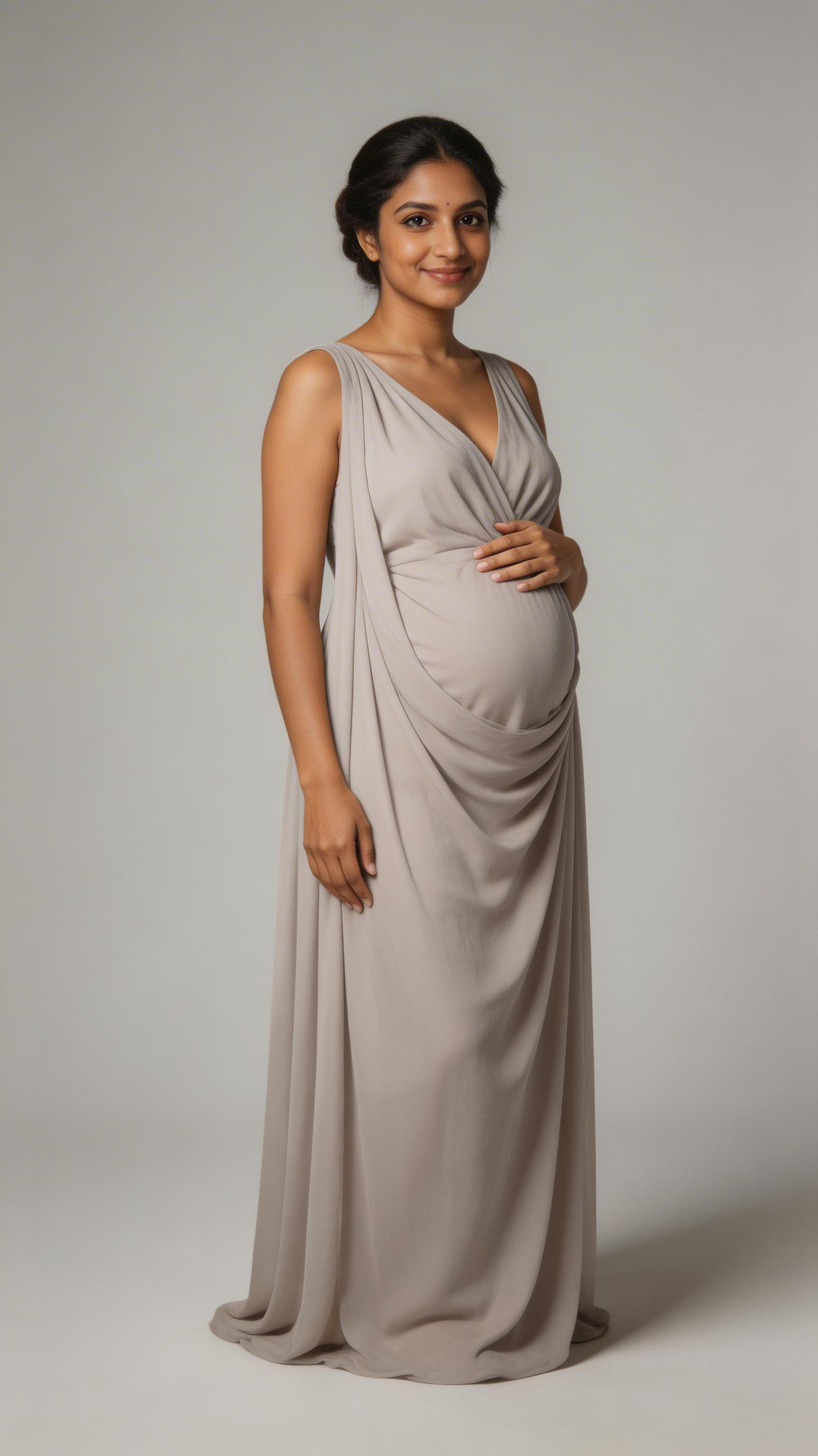 Full-body studio portrait of a pregnant South Asian woman standing with confident posture, wearing an elegant maternity gown with draped fabric. Neutral backdrop, soft directional lighting, classic maternity photoshoot style, realistic fabric and skin detail, no text, no watermarks, no logos, no overlays