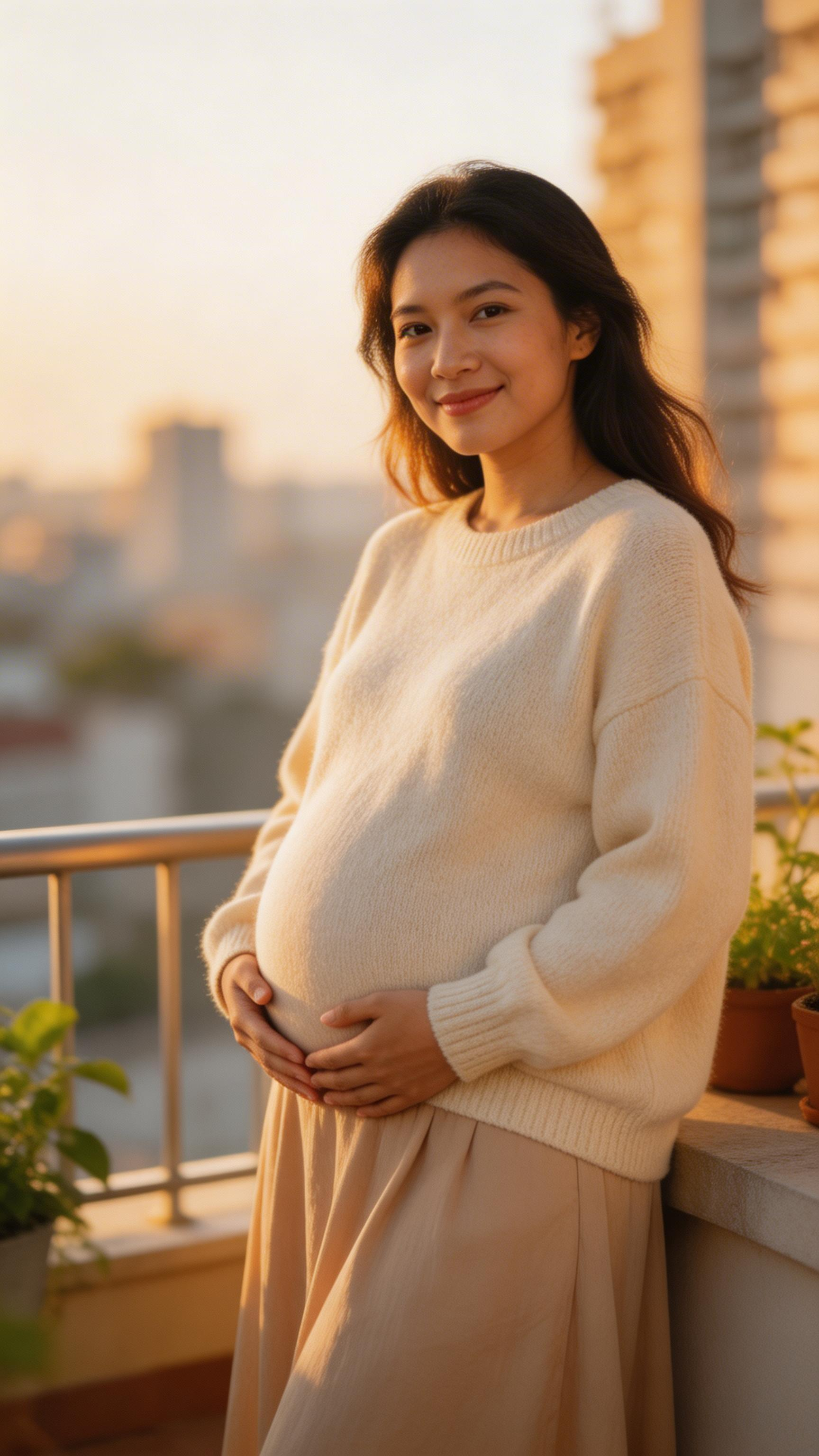 Three-quarter lifestyle portrait of a pregnant Southeast Asian woman on a balcony, hands on belly, relaxed smile, wearing a knit maternity sweater and comfortable skirt. Golden hour light, city background softly blurred, warm cinematic tones, no text, no watermarks, no logos, no overlays