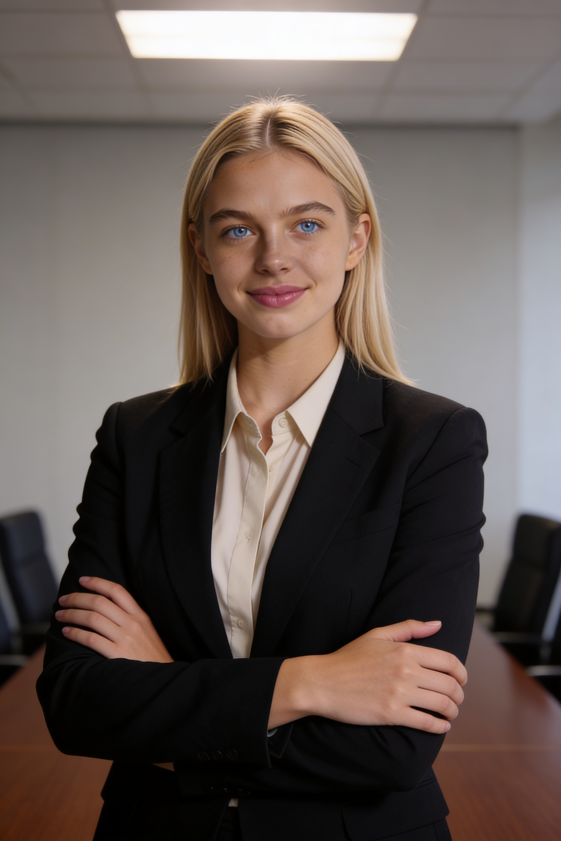 Single photograph of exactly the same person as the reference image(s), consistent identity realistic photograph, female person, 24 years old, light-blue eyes, blonde hair color, straight hair style, ivory skin Hair color must stay blonde. Keep hairstyle consistent (straight). Do not change defining physical features. No wigs. No hats. Face unobscured. Portrait 2:3 aspect ratio. Same Hispanic/Latino male attorney, consistent facial features, half-body in a conference room, arms loosely crossed. Outfit: black blazer/suit with light shirt, professional and conservative. Lighting: soft overhead with added key light, modern law firm headshots style, neutral background blur, no screens. no captions, no writing, no text, no watermarks, no logos, no overlays