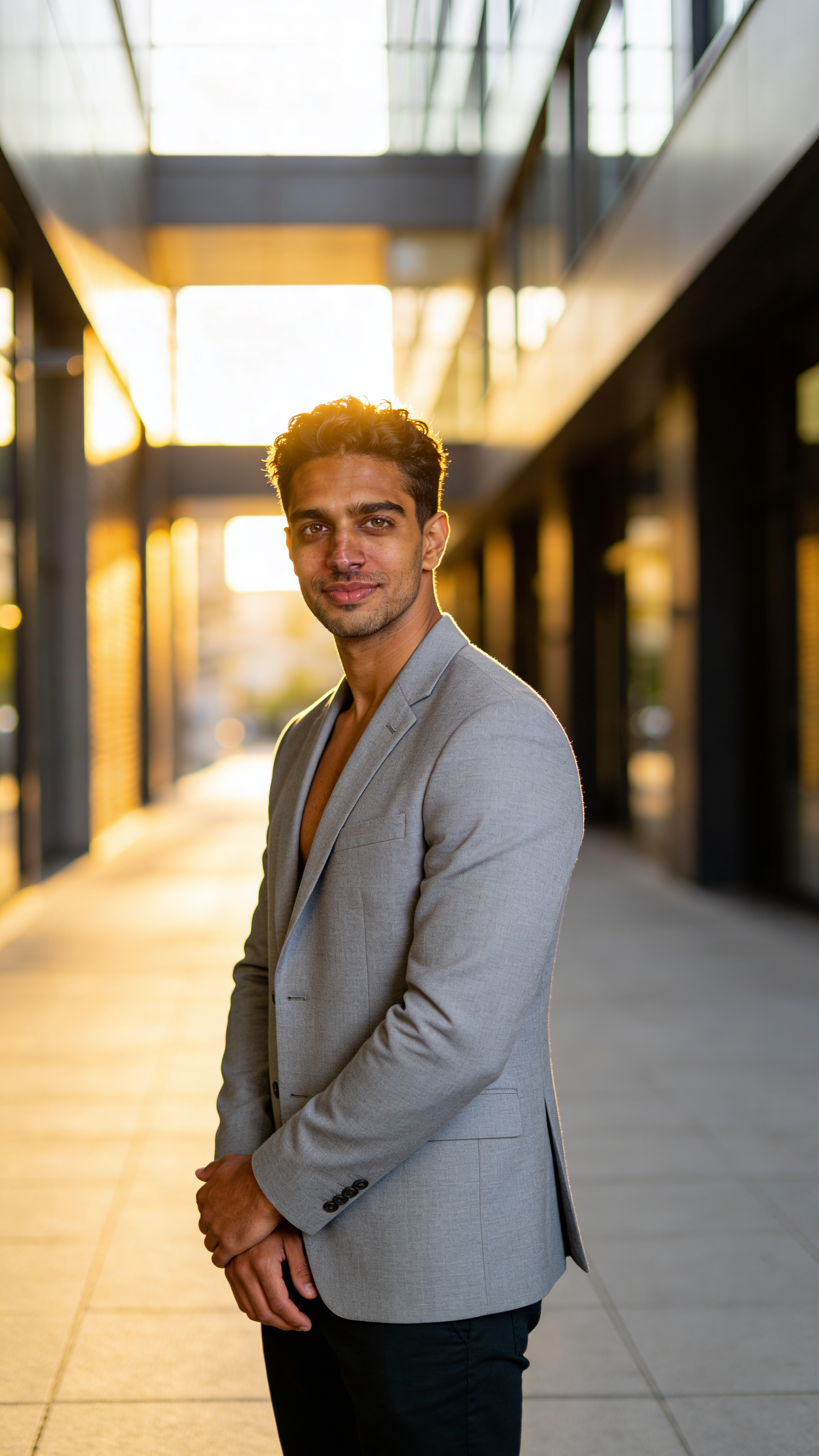 A man/male person. Environmental shot. Outdoor professional portrait scene during golden hour on a clean urban walkway with modern architecture. The same character is 3/4 body, standing with relaxed posture, hands loosely clasped, wearing a light gray suit or blazer with no tie. Warm sunlight highlights hair and shoulders, background softly blurred for an approachable, high-end LinkedIn feel, no text, no watermarks, no logos, no overlays, no captions, no writing
