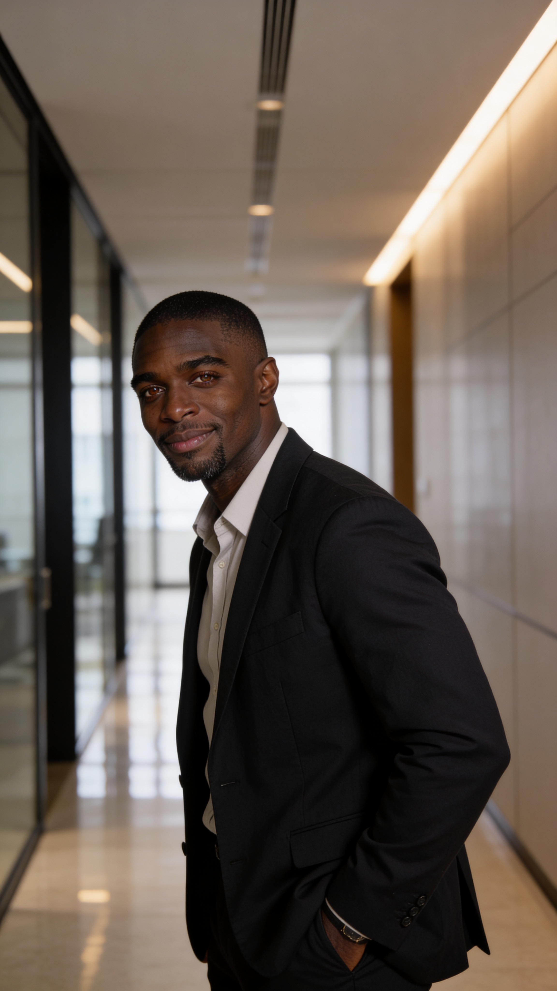 A man/male person. Environmental shot. Professional corridor portrait scene in a modern office hallway with leading lines and soft reflections. The same character stands in a 3/4 body pose, one hand in pocket, wearing a dark blazer and light shirt. Balanced indoor lighting with slight rim light, confident expression with a small smile, background softly blurred for depth, no text, no watermarks, no logos, no overlays, no captions, no writing