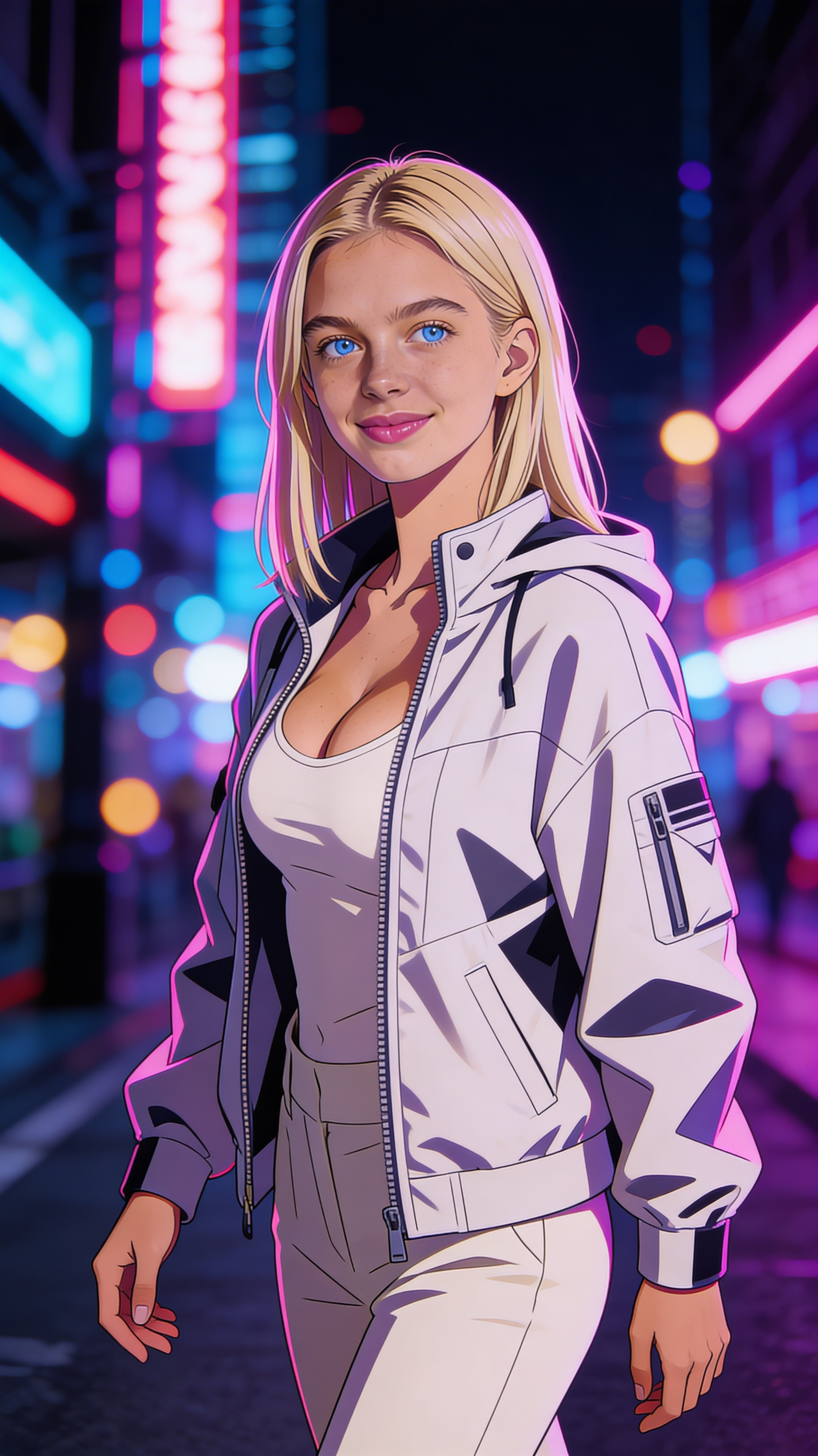 Single photograph of exactly the same person as the reference image(s), consistent identity realistic photograph, female person, 24 years old, light-blue eyes, blonde hair color, straight hair style, ivory skin Hair color must stay blonde. Keep hairstyle consistent (straight). Do not change defining physical features. No wigs. No hats. Face unobscured. Environmental shot. Anime-style environmental portrait scene for the SAME consistent character walking through a neon-lit city at night, cinematic bokeh lights, slight three-quarter angle, confident expression. Outfit: modern streetwear jacket, hands relaxed at sides. Lighting: dramatic neon rim light with balanced face exposure, high-detail linework. Show strong identity consistency while changing mood and location. No captions, no writing, no text, no watermarks, no logos, no overlays