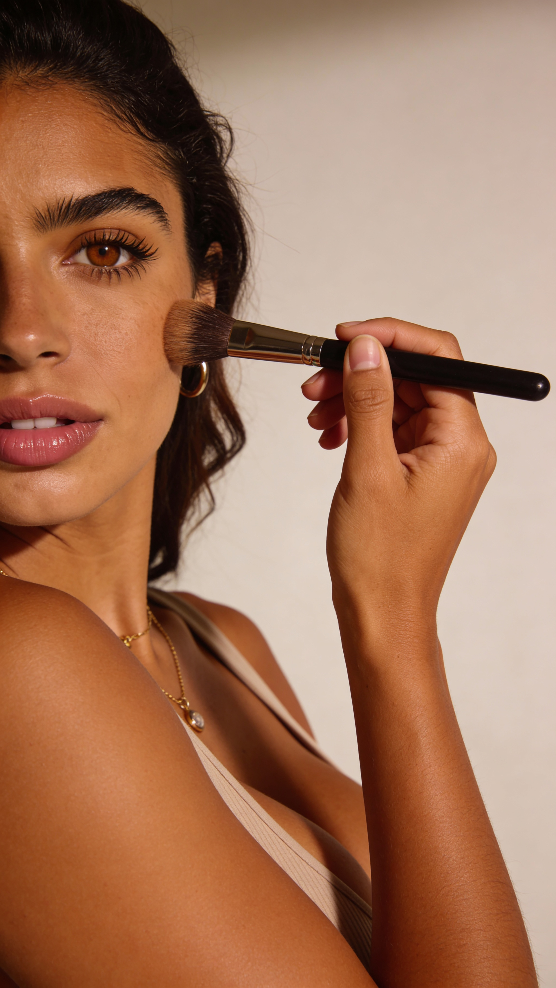 Single photograph of exactly the same person as the reference image(s), consistent identity realistic photograph, female person, 27 years old, brown eyes, dark-brown hair color, wavy hair style, olive skin, medium natural breasts (Cup size D) covered with clothing Hair color must stay dark-brown. Keep hairstyle consistent (wavy). Do not change defining physical features. No wigs. No hats. Face unobscured. Headshot shot. Beauty creator close-up scene with flattering beauty lighting; subject holding a makeup brush near cheek, soft glam look, smooth skin detail, warm highlights, clean background blur. Keep identical facial features across multiple expressions and angles for product reviews and tutorials, no captions, no writing, no text, no watermarks, no logos, no overlays