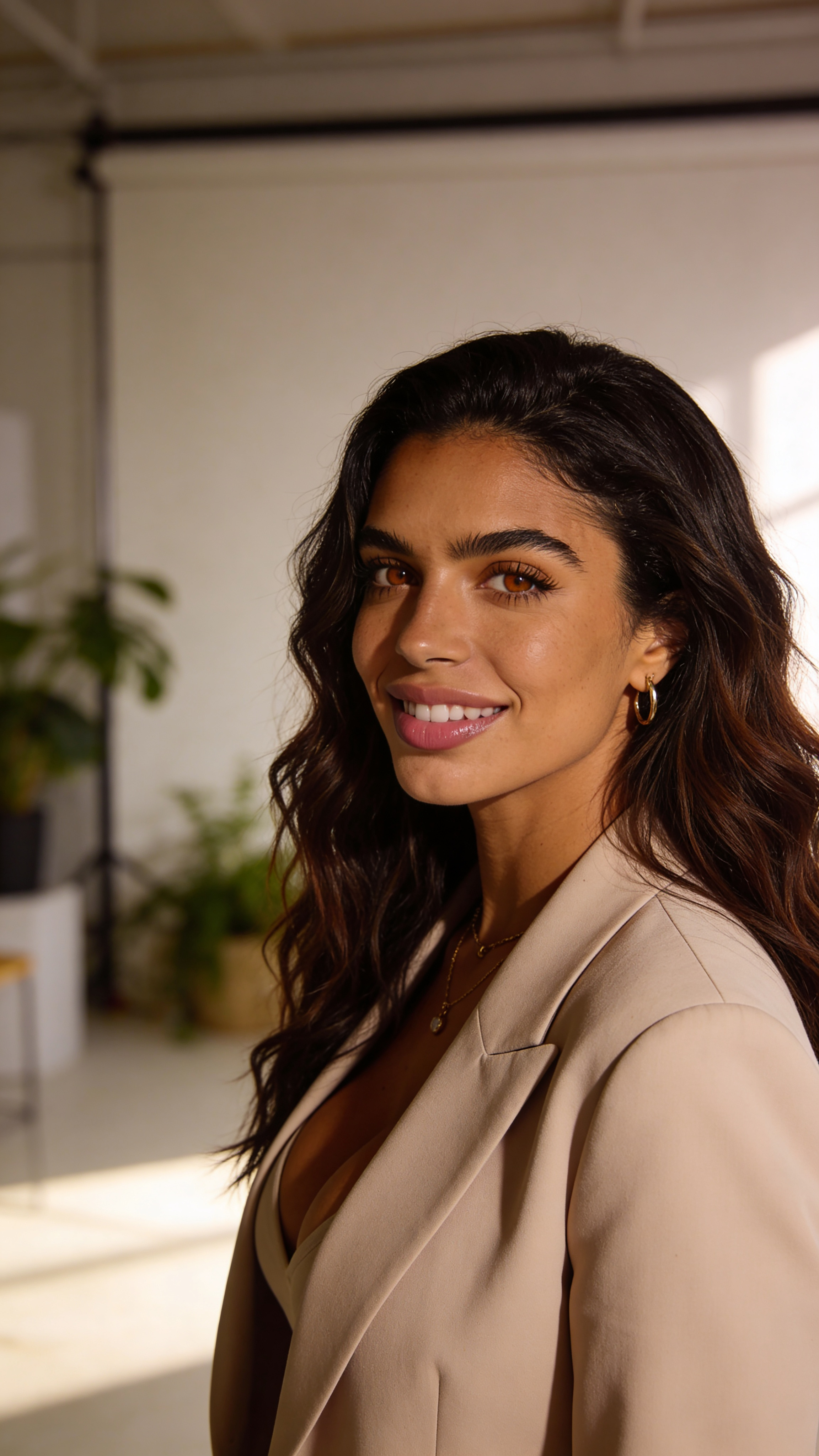 Single photograph of exactly the same person as the reference image(s), consistent identity realistic photograph, female person, 27 years old, brown eyes, dark-brown hair color, wavy hair style, olive skin, medium natural breasts (Cup size D) covered with clothing Hair color must stay dark-brown. Keep hairstyle consistent (wavy). Do not change defining physical features. No wigs. No hats. Face unobscured. Headshot shot. Minimalist creative studio interior with plants and clean textures in the background blur. The same character is framed head-and-shoulders, slightly turned, with a friendly professional smile. Outfit: modern blazer with a simple top. Soft daylight and fill light, natural realism, perfect for a profile picture maker gallery, no text, no watermarks, no logos, no overlays