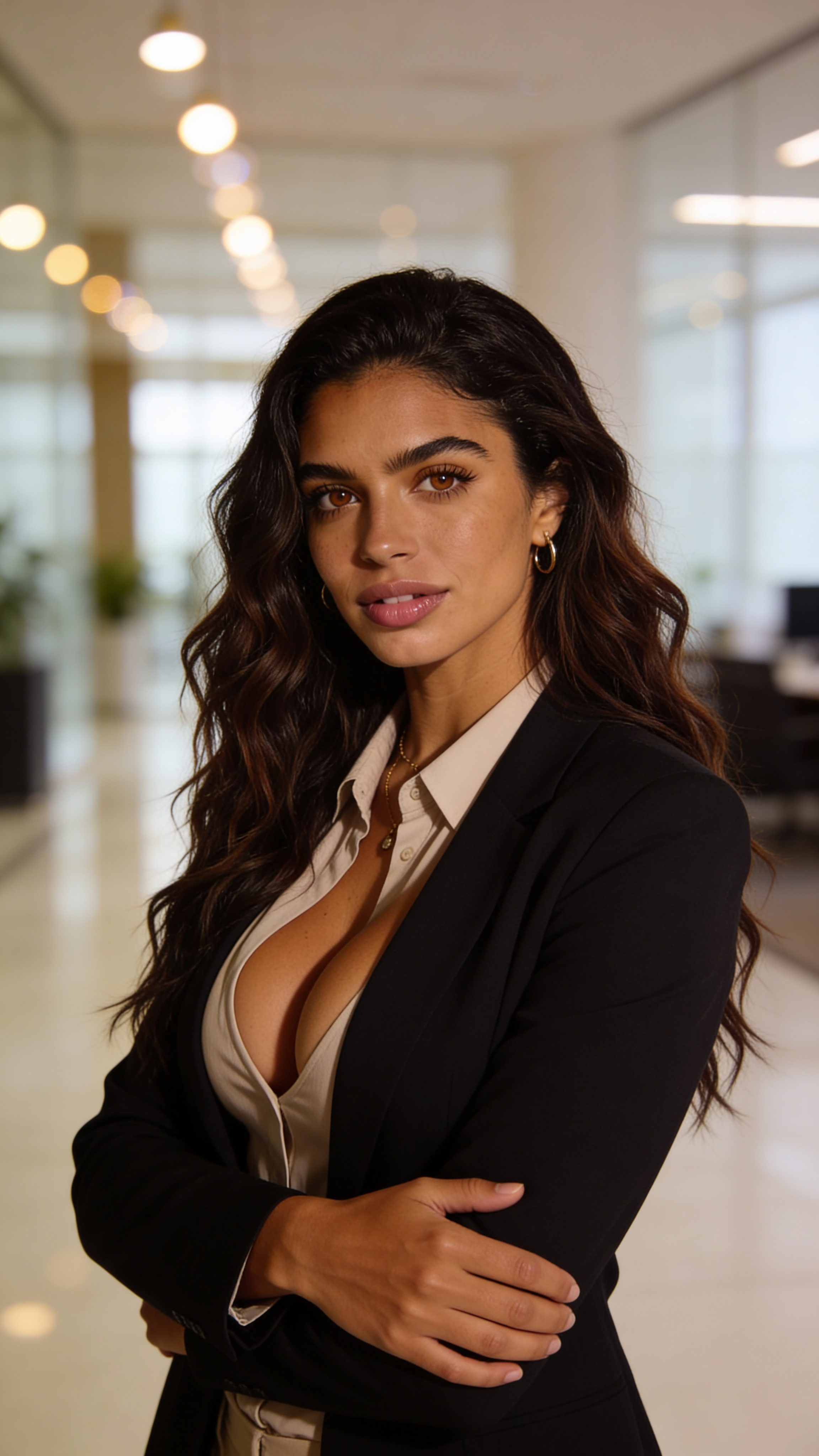 Single photograph of exactly the same person as the reference image(s), consistent identity realistic photograph, female person, 27 years old, brown eyes, dark-brown hair color, wavy hair style, olive skin, medium natural breasts (Cup size D) covered with clothing Hair color must stay dark-brown. Keep hairstyle consistent (wavy). Do not change defining physical features. No wigs. No hats. Face unobscured. Half-body shot. Professional office-lobby environment with soft bokeh lights and a clean modern feel. The same character is half-body, arms loosely crossed, expression confident and approachable. Outfit is business casual with a blazer and blouse/shirt. Balanced indoor lighting with catchlights, profile-ready composition, no text, no watermarks, no logos, no overlays