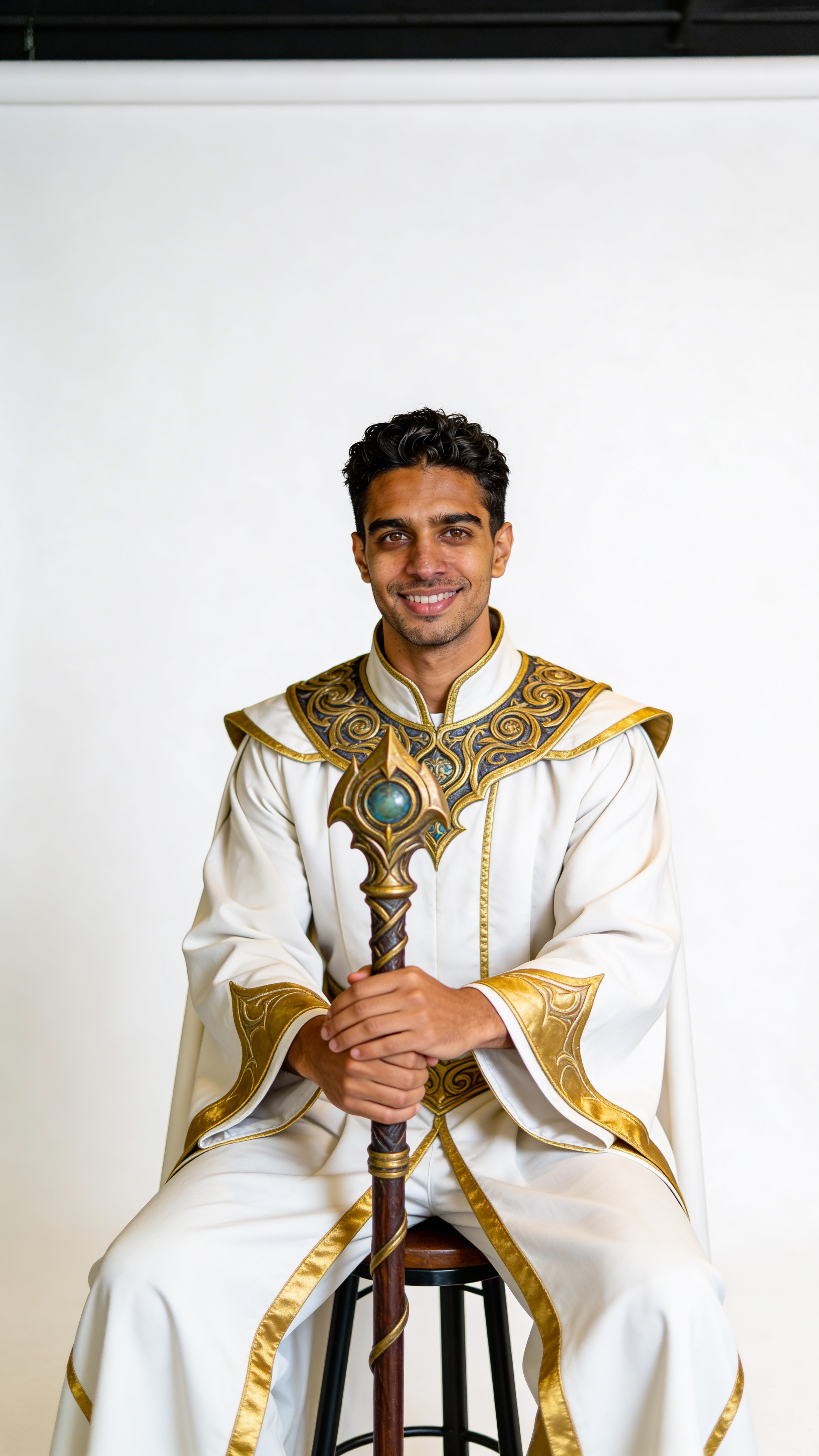 Single photograph of exactly the same person as the reference image(s), consistent identity realistic photograph, male person, 32 years old, dark-brown eyes, black hair color, textured hair style, caramel skin Hair color must stay black. Keep hairstyle consistent (textured). Do not change defining physical features. No wigs. No hats. Face unobscured. Half-body shot. High-key modern studio scene with white backdrop for a World of Warcraft-inspired priest/healer cosplay: white-and-gold robes, ornate collar, staff prop. Pose: seated on stool, upright posture, warm approachable smile, hands resting on staff. Clean softbox lighting, crisp fabric detail, minimal shadows, no captions, no writing, no text, no watermarks, no logos, no overlays