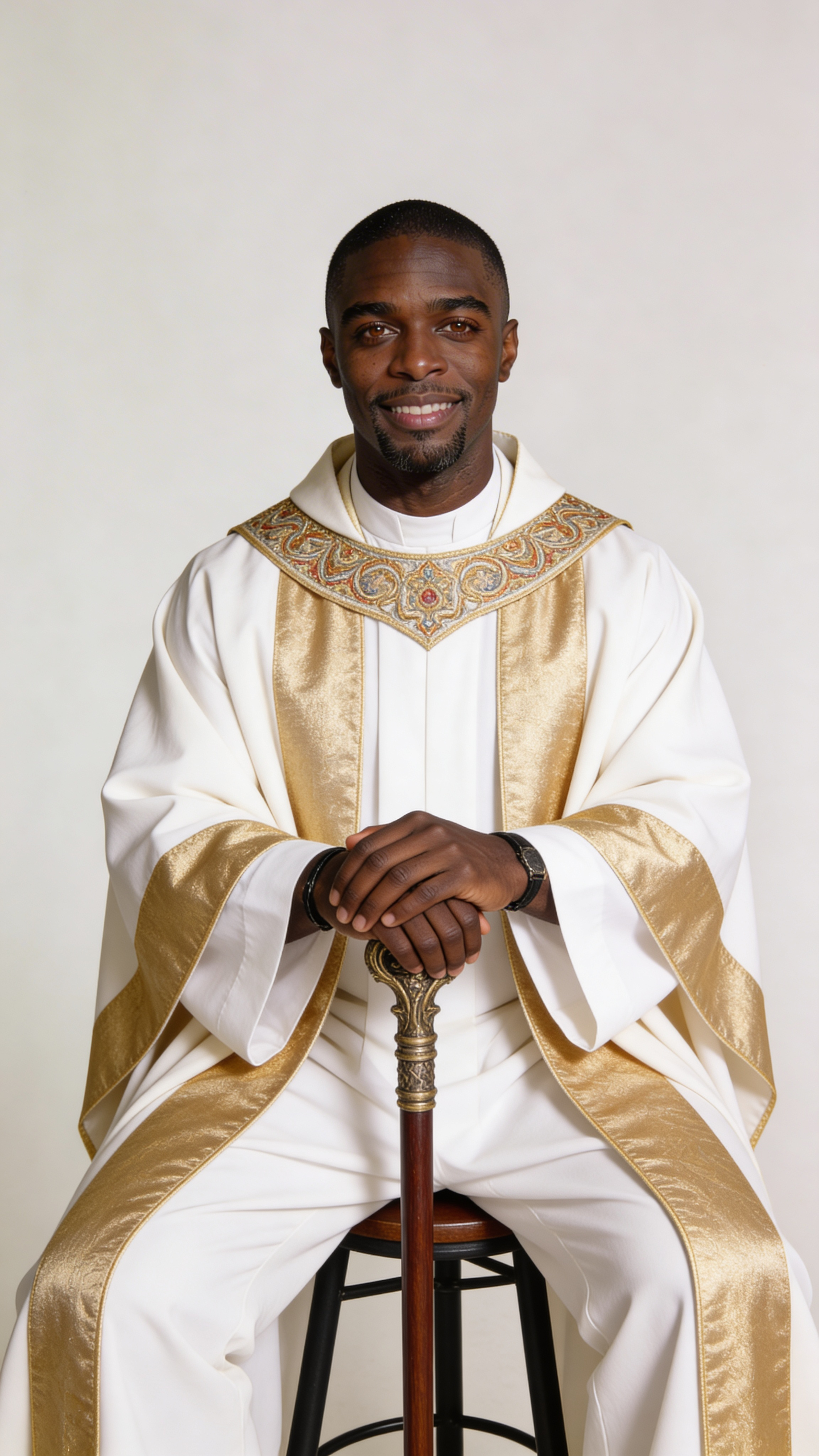 Single photograph of exactly the same person as the reference image(s), consistent identity realistic photograph, male person, 39 years old, dark-brown eyes, black hair color, classic hair style, ebony skin Hair color must stay black. Keep hairstyle consistent (classic). Do not change defining physical features. No wigs. No hats. Face unobscured. Half-body shot. High-key modern studio scene with white backdrop for a World of Warcraft-inspired priest/healer cosplay: white-and-gold robes, ornate collar, staff prop. Pose: seated on stool, upright posture, warm approachable smile, hands resting on staff. Clean softbox lighting, crisp fabric detail, minimal shadows, no captions, no writing, no text, no watermarks, no logos, no overlays