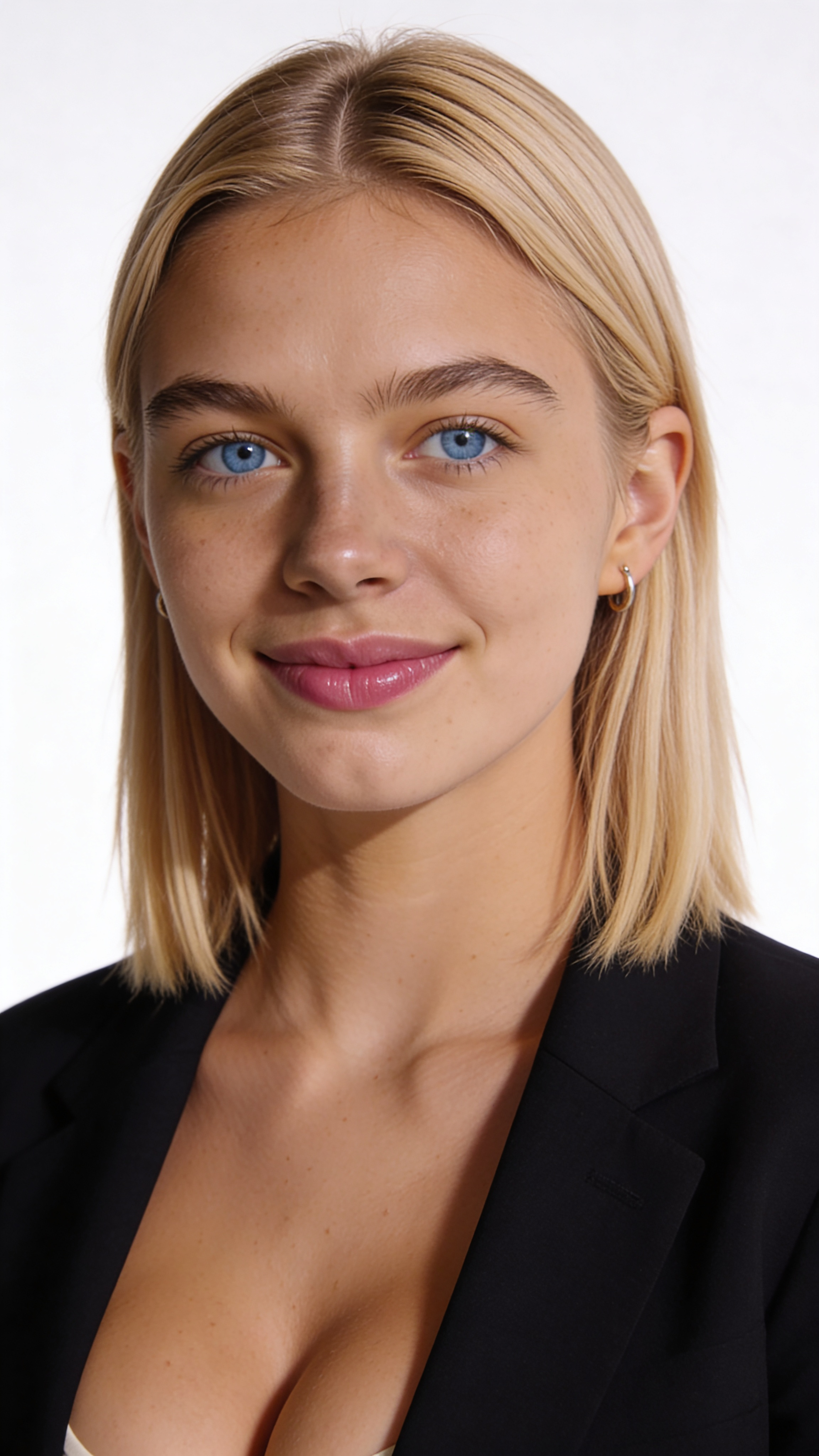 A woman/female person. Headshot shot. Clean white-background studio portrait designed for a crisp LinkedIn profile photo. The same character wears a black blazer and simple accessories, head-and-shoulders framing, direct eye contact, confident approachable smile. High-key lighting with soft shadows under the chin, natural skin texture, sharp eyes, subtle background gradient for depth, no text, no watermarks, no logos, no overlays, no captions, no writing