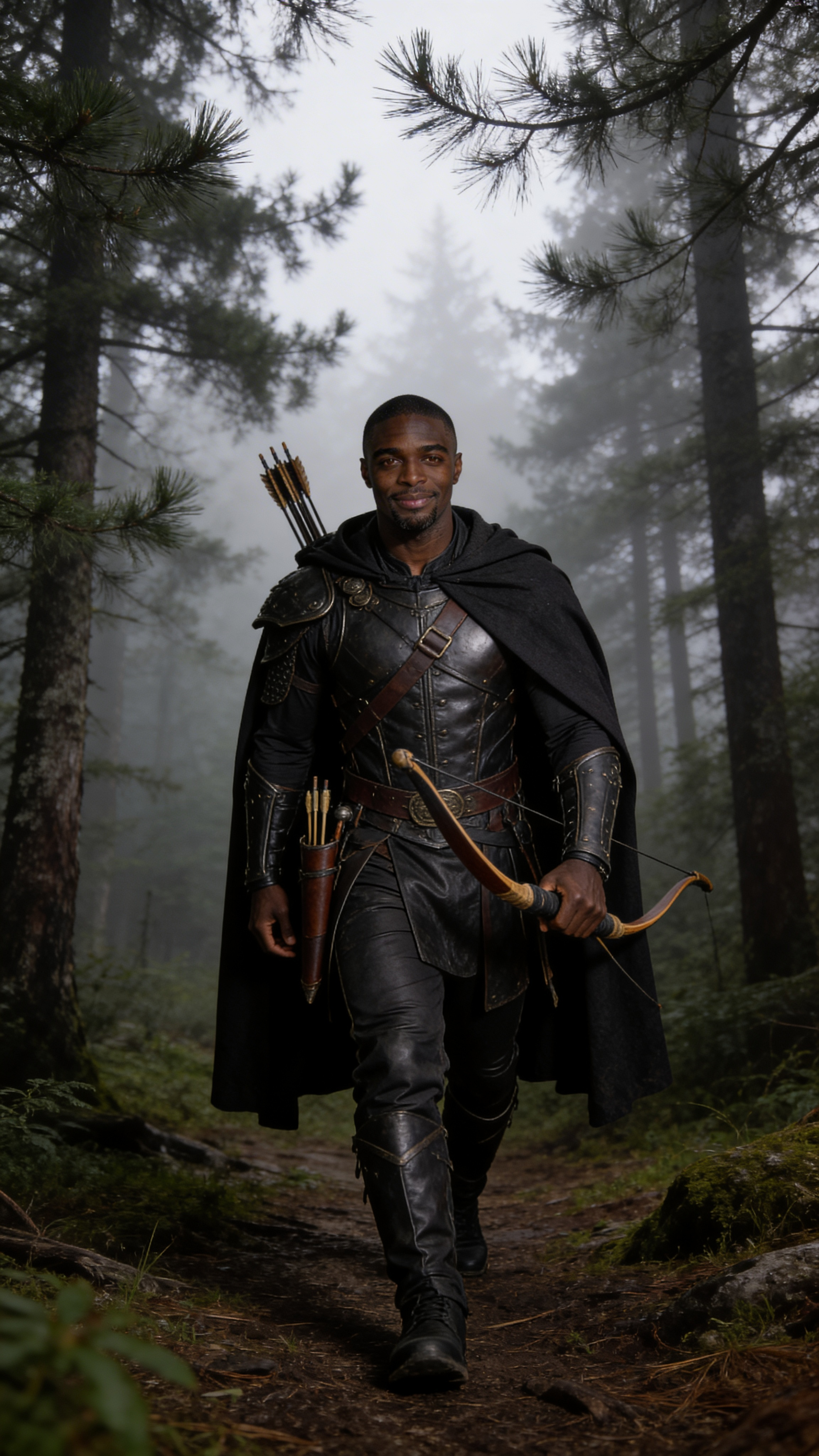 Single photograph of exactly the same person as the reference image(s), consistent identity realistic photograph, male person, 39 years old, dark-brown eyes, black hair color, classic hair style, ebony skin Hair color must stay black. Keep hairstyle consistent (classic). Do not change defining physical features. No wigs. No hats. Face unobscured. Environmental shot. Moody forest scene for a World of Warcraft-inspired hunter cosplay: pine trees, mist, soft overcast light. Outfit: leather armor, cloak, quiver, bow prop. Pose: walking toward camera mid-step, relaxed smile, looking directly at viewer. Natural color grading, shallow depth of field, crisp costume details, no captions, no writing, no text, no watermarks, no logos, no overlays