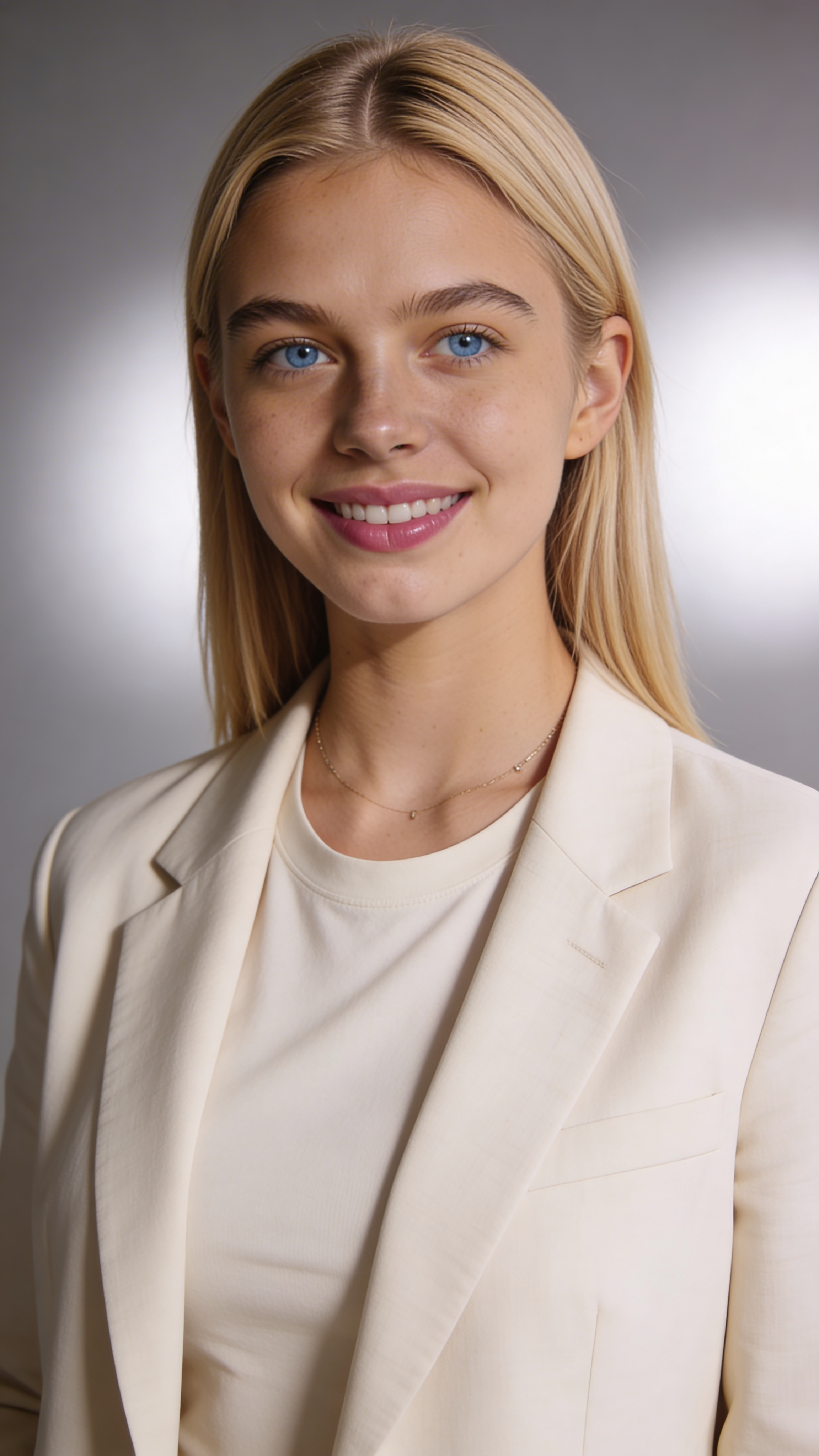 Single photograph of exactly the same person as the reference image(s), consistent identity realistic photograph, female person, 24 years old, light-blue eyes, blonde hair color, straight hair style, ivory skin, medium natural breasts (Cup size D) covered with clothing Hair color must stay blonde. Keep hairstyle consistent (straight). Do not change defining physical features. No wigs. No hats. Face unobscured. Headshot shot. Editorial studio headshot setup with a soft gray seamless background and diffused softbox lighting. Subject facing camera with a confident, friendly smile, clean skin tones, minimal retouching. Outfit: modern neutral blazer over a simple tee, understated jewelry. Composition tight head-and-shoulders, crisp focus, subtle catchlights, Instagram-ready professional vibe. Ensure there are no captions or writing anywhere in the image; no text, no watermarks, no logos, no overlays