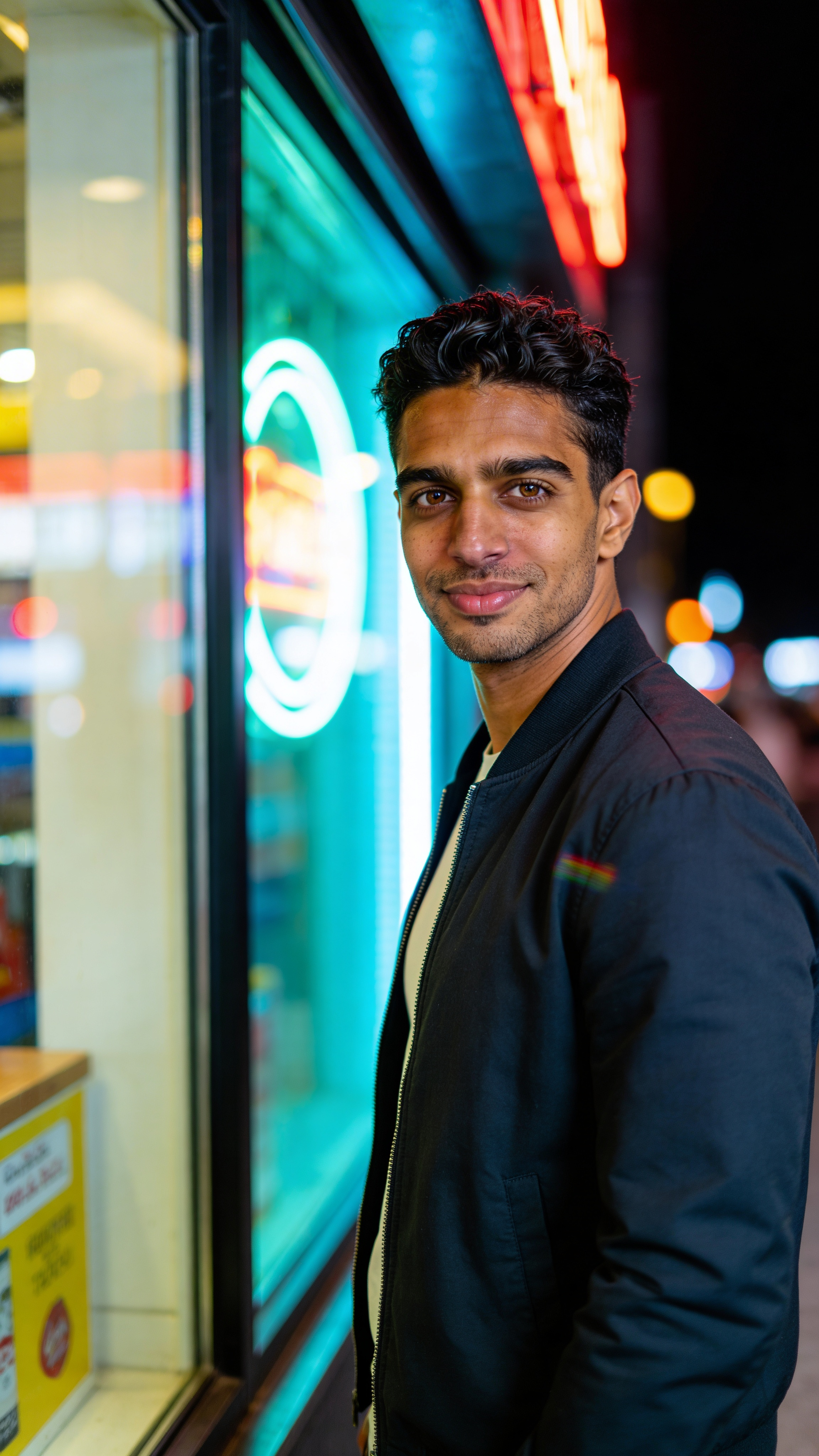 Single photograph of exactly the same person as the reference image(s), consistent identity realistic photograph, male person, 32 years old, dark-brown eyes, black hair color, textured hair style, caramel skin, Very tiny chest (flat upper body) covered with clothing Hair color must stay black. Keep hairstyle consistent (textured). Do not change defining physical features. No wigs. No hats. Face unobscured. Environmental shot. Nighttime neon city portrait with cinematic colored reflections and shallow depth of field. Subject standing near a storefront glow, looking at camera with a subtle confident smile. Outfit: dark jacket with clean styling. Half-body framing, dramatic but realistic lighting, ideal for bold Instagram photoshoot content. Ensure there are no captions or writing anywhere in the image; no text, no watermarks, no logos, no overlays