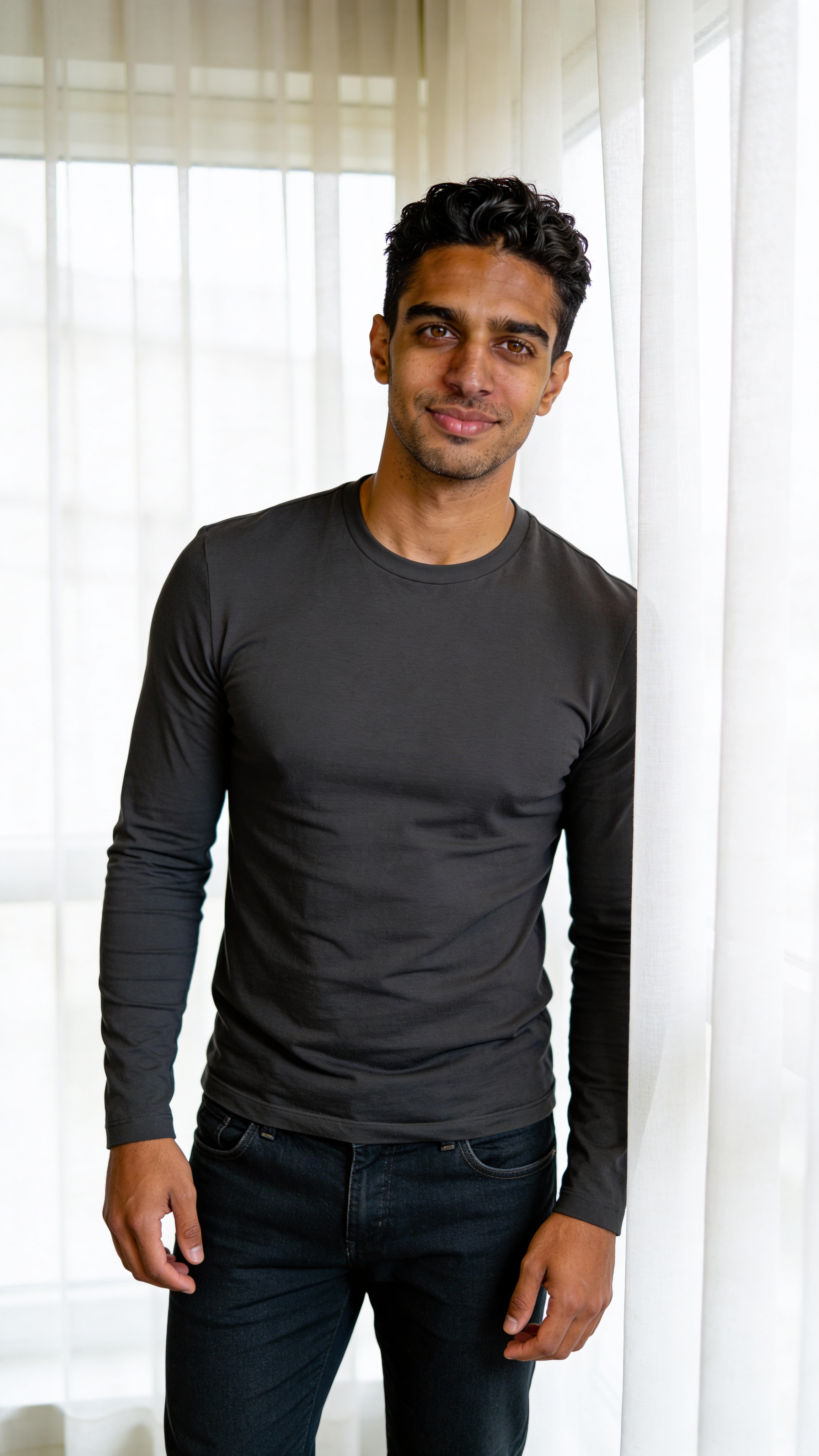 Single photograph of exactly the same person as the reference image(s), consistent identity realistic photograph, male person, 32 years old, dark-brown eyes, black hair color, textured hair style, caramel skin, Very tiny chest (flat upper body) covered with clothing Hair color must stay black. Keep hairstyle consistent (textured). Do not change defining physical features. No wigs. No hats. Face unobscured. Half-body shot. A realistic indoor apartment photoshoot with soft window light and minimal décor. The same character stands by sheer curtains, relaxed posture, gentle smile and direct eye contact. Outfit: fitted long-sleeve top and jeans. Bright airy background blur, clean modern vibe that looks like real dating app photos from home. no text, no watermarks, no logos, no overlays, no captions, no writing. no text, no watermarks, no logos, no overlays