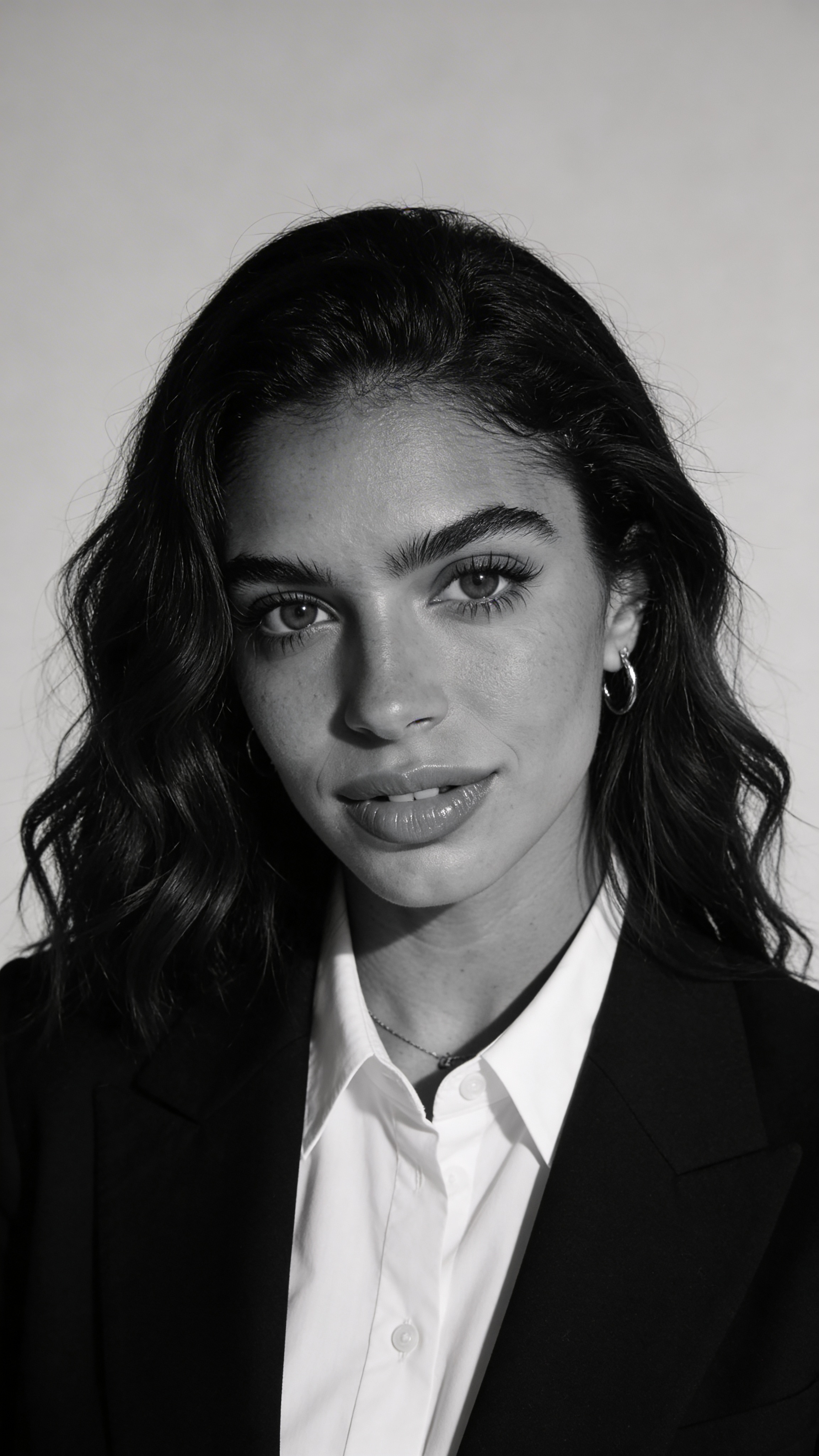 Single photograph of exactly the same person as the reference image(s), consistent identity realistic photograph, female person, 27 years old, brown eyes, dark-brown hair color, wavy hair style, olive skin Hair color must stay dark-brown. Keep hairstyle consistent (wavy). Do not change defining physical features. No wigs. No hats. Face unobscured. Headshot shot. Creative but professional scene: black-and-white studio headshot with seamless background, head-and-shoulders framing, subtle smile, crisp contrast and sharp eyes. Outfit: dark blazer and white shirt. Lighting: classic Rembrandt-style portrait light, timeless corporate look, no captions or writing; no text, no watermarks, no logos, no overlays