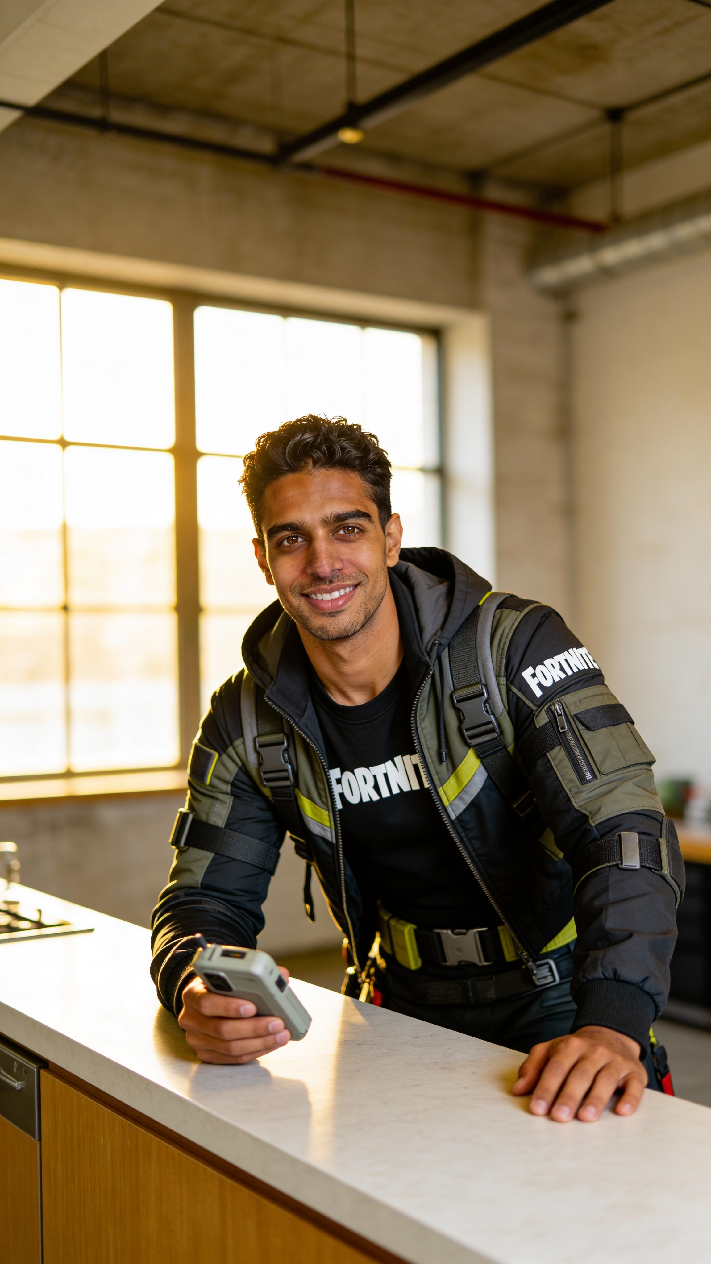 Single photograph of exactly the same person as the reference image(s), consistent identity realistic photograph, male person, 32 years old, dark-brown eyes, black hair color, textured hair style, caramel skin Hair color must stay black. Keep hairstyle consistent (textured). Do not change defining physical features. No wigs. No hats. Face unobscured. Half-body shot. Half-body lifestyle scene in a modern loft for a Fortnite costume portrait: large window light, warm tone, shallow depth of field. The same character wears Fortnite-inspired streetwear cosplay with layered jacket and belt straps, leaning on a countertop holding a neutral prop gadget, relaxed approachable grin. Keep facial features identical across variations while changing pose slightly. No captions, no writing, no text, no watermarks, no logos, no overlays