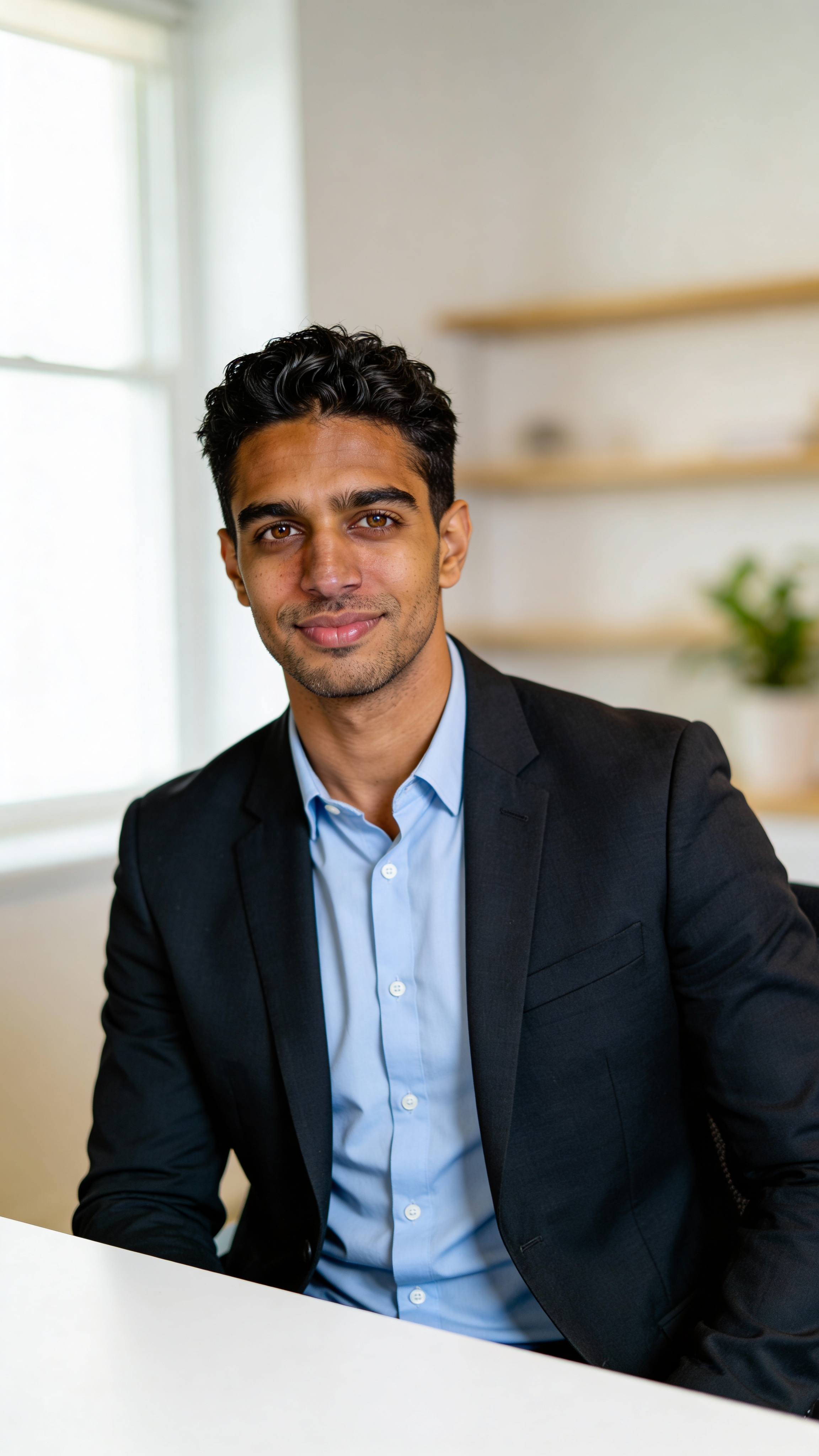 Single photograph of exactly the same person as the reference image(s), consistent identity realistic photograph, male person, 32 years old, dark-brown eyes, black hair color, textured hair style, caramel skin, Very tiny chest (flat upper body) covered with clothing Hair color must stay black. Keep hairstyle consistent (textured). Do not change defining physical features. No wigs. No hats. Face unobscured. Half-body shot. Home office portrait with a clean, minimalist background, soft blurred shelves and a plant for depth (no readable items). Subject is half-body, seated upright at a desk edge, calm confident smile, direct eye contact. Outfit: light-blue shirt and dark blazer. Natural window light balanced with fill to avoid harsh shadows, realistic texture for a photo for resume from home; no text, no watermarks, no logos, no overlays.