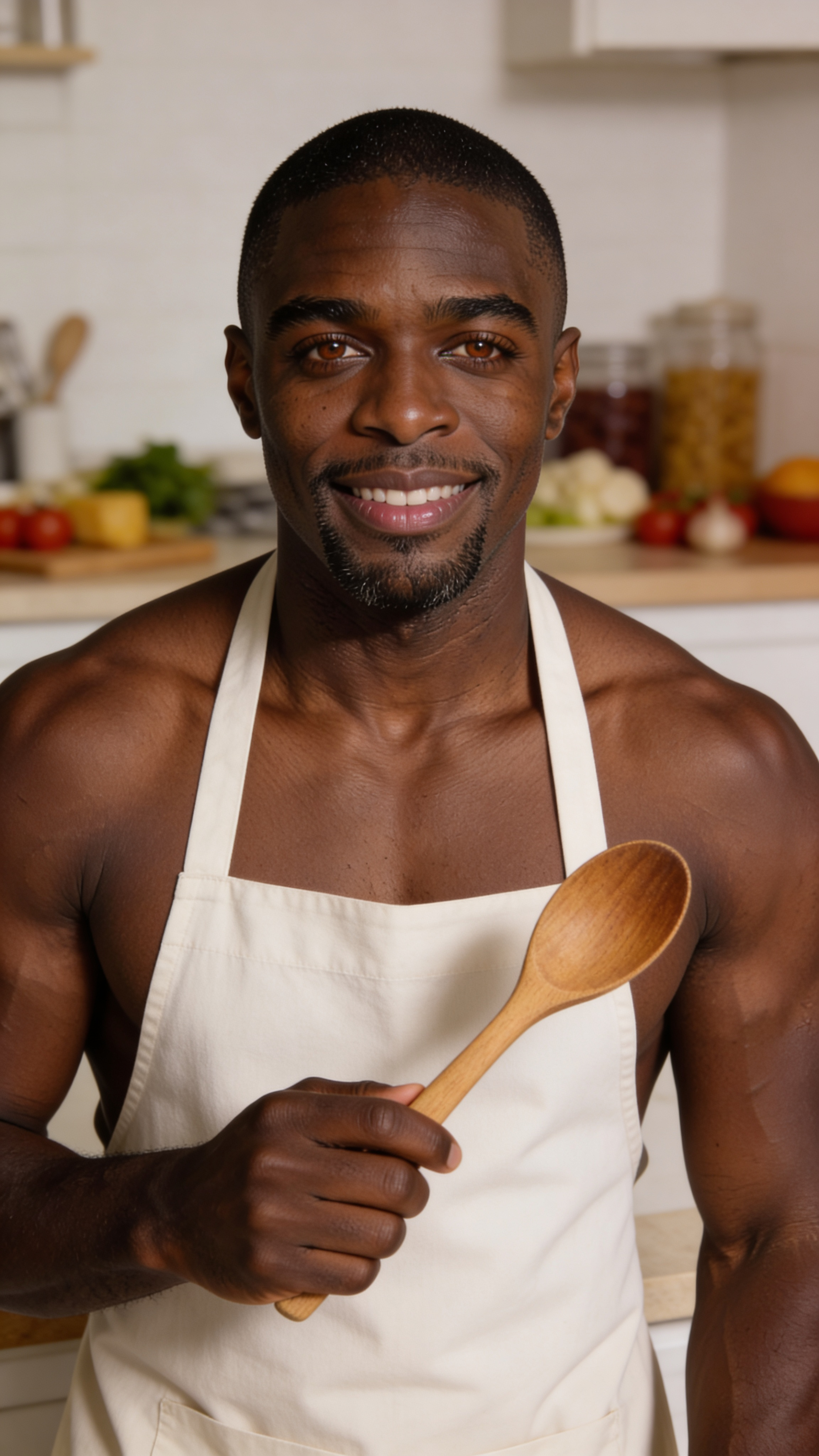Single photograph of exactly the same person as the reference image(s), consistent identity realistic photograph, male person, 39 years old, dark-brown eyes, black hair color, classic hair style, ebony skin, Very tiny chest (flat upper body) covered with clothing Hair color must stay black. Keep hairstyle consistent (classic). Do not change defining physical features. No wigs. No hats. Face unobscured. Environmental shot. Food creator kitchen scene with soft daylight; subject wearing a simple apron, holding a wooden spoon, smiling toward camera, ingredients blurred on counter, cozy warm tones, natural candid look. Same character across multiple cooking poses for weekly content batches, no captions, no writing, no text, no watermarks, no logos, no overlays