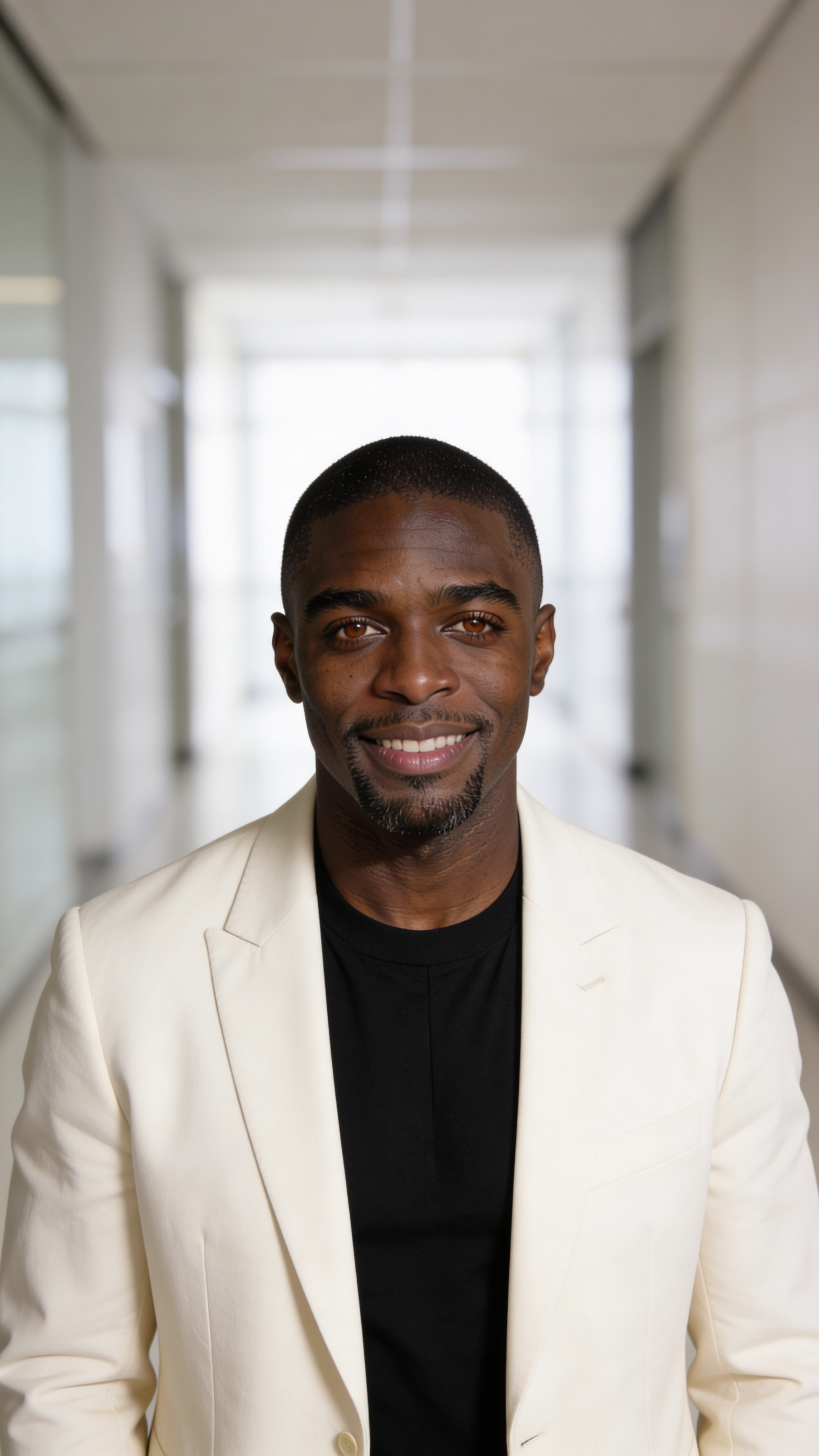 Single photograph of exactly the same person as the reference image(s), consistent identity realistic photograph, male person, 39 years old, dark-brown eyes, black hair color, classic hair style, ebony skin, Very tiny chest (flat upper body) covered with clothing Hair color must stay black. Keep hairstyle consistent (classic). Do not change defining physical features. No wigs. No hats. Face unobscured. Environmental shot. Bright corridor portrait in a minimalist corporate hallway with soft bokeh lines and neutral walls. Subject is chest-up, standing with shoulders squared, friendly smile, eyes sharp in focus. Outfit: cream blazer over black top, neat styling. Lighting is diffused and flattering, designed to look like a professional resume photo online; no text, no watermarks, no logos, no overlays.