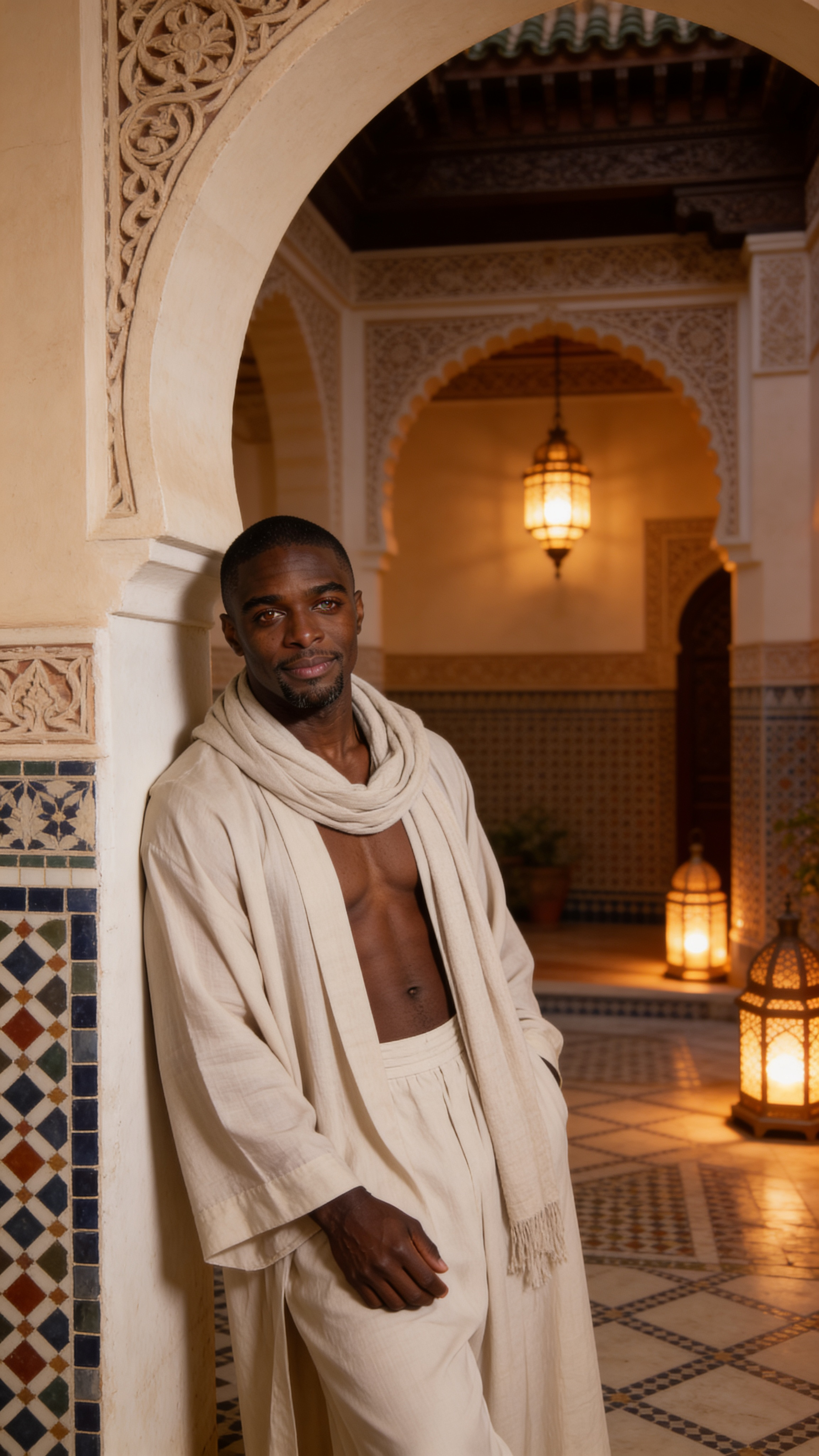 Single photograph of exactly the same person as the reference image(s), consistent identity realistic photograph, male person, 39 years old, dark-brown eyes, black hair color, classic hair style, ebony skin, Very tiny chest (flat upper body) covered with clothing Hair color must stay black. Keep hairstyle consistent (classic). Do not change defining physical features. No wigs. No hats. Face unobscured. Environmental shot. Riad courtyard scene in Morocco-inspired architecture with patterned tiles and soft lantern glow. The same AI character leans casually against an archway, wearing a flowing neutral outfit and light scarf. Warm ambient light, rich textures, editorial portrait framing, no text, no watermarks, no logos, no overlays, no captions, no writing