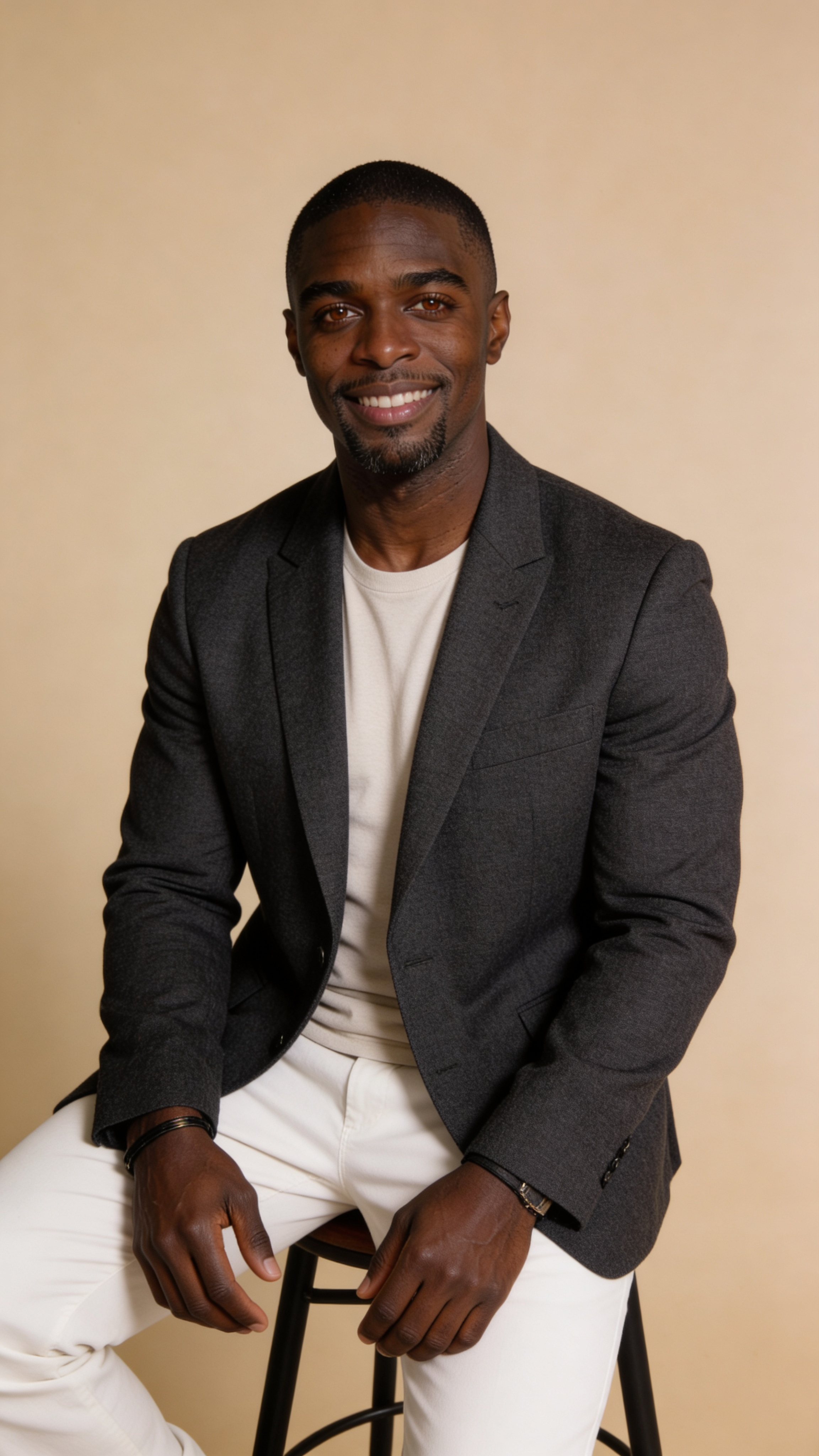 Single photograph of exactly the same person as the reference image(s), consistent identity realistic photograph, male person, 39 years old, dark-brown eyes, black hair color, classic hair style, ebony skin, Very tiny chest (flat upper body) covered with clothing Hair color must stay black. Keep hairstyle consistent (classic). Do not change defining physical features. No wigs. No hats. Face unobscured. Half-body shot. Minimal studio setting with warm beige seamless background and softbox lighting. The same AI character is half-body, seated upright on a stool with relaxed shoulders, wearing a charcoal blazer over a light top, friendly approachable smile. Crisp focus on eyes, gentle shadow shaping, clean modern professional AI headshot style, no captions or writing, no text, no watermarks, no logos, no overlays