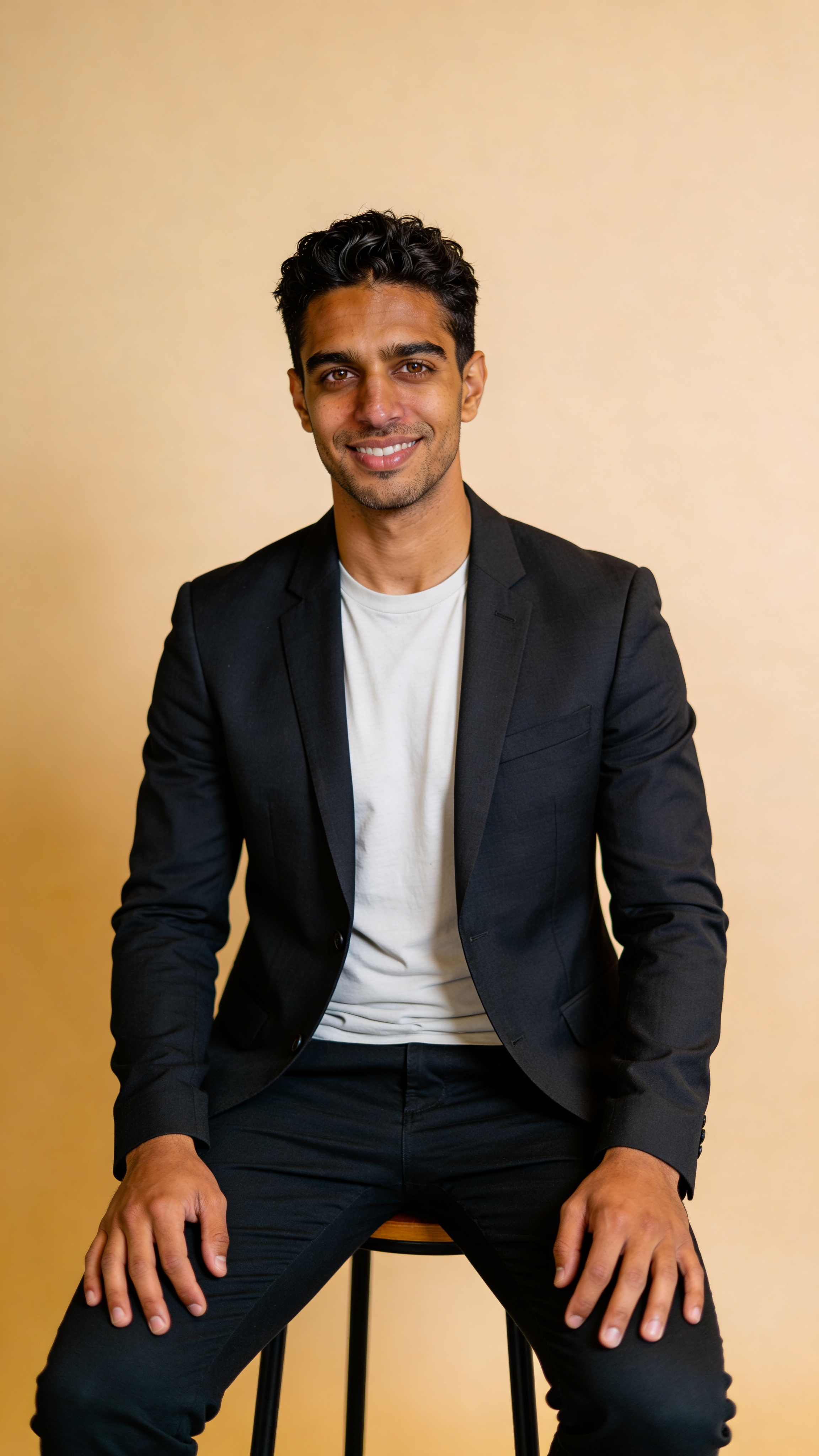 Single photograph of exactly the same person as the reference image(s), consistent identity realistic photograph, male person, 32 years old, dark-brown eyes, black hair color, textured hair style, caramel skin, Very tiny chest (flat upper body) covered with clothing Hair color must stay black. Keep hairstyle consistent (textured). Do not change defining physical features. No wigs. No hats. Face unobscured. Half-body shot. Minimal studio setting with warm beige seamless background and softbox lighting. The same AI character is half-body, seated upright on a stool with relaxed shoulders, wearing a charcoal blazer over a light top, friendly approachable smile. Crisp focus on eyes, gentle shadow shaping, clean modern professional AI headshot style, no captions or writing, no text, no watermarks, no logos, no overlays