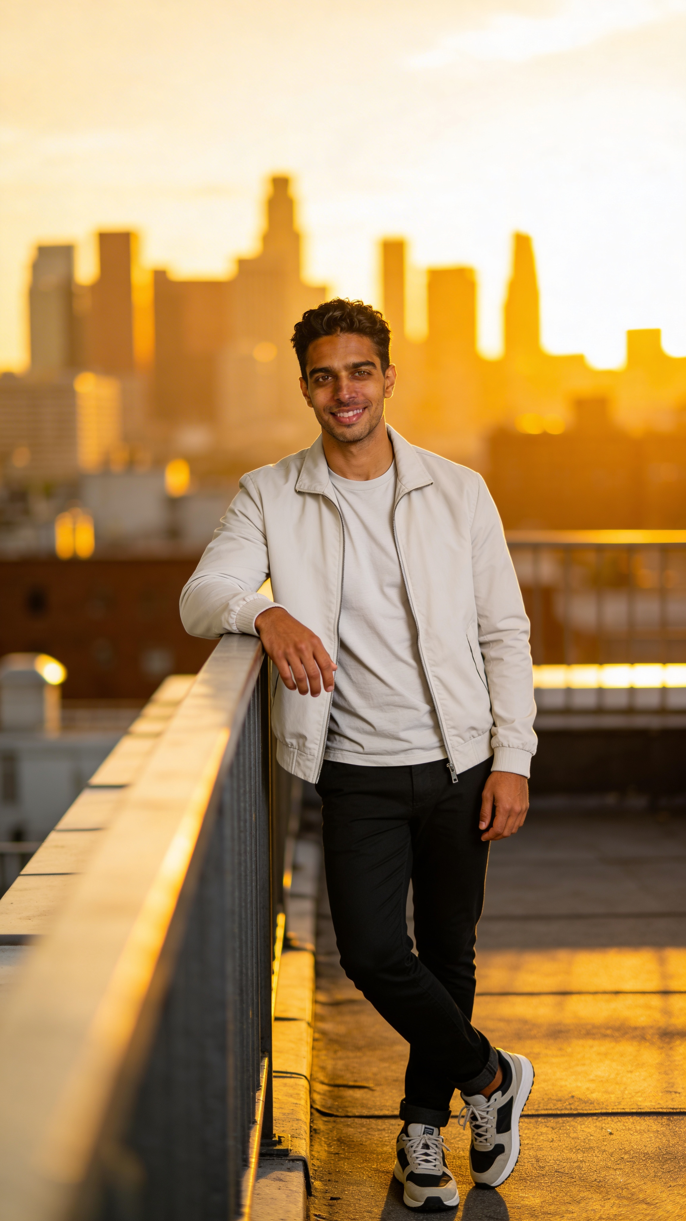 Single photograph of exactly the same person as the reference image(s), consistent identity realistic photograph, male person, 32 years old, dark-brown eyes, black hair color, textured hair style, caramel skin, Very tiny chest (flat upper body) covered with clothing Hair color must stay black. Keep hairstyle consistent (textured). Do not change defining physical features. No wigs. No hats. Face unobscured. Environmental shot. Golden-hour rooftop lifestyle portrait with warm rim light and soft city skyline bokeh. Subject leaning lightly on a railing, relaxed posture, approachable smile. Outfit: monochrome streetwear with a light jacket and clean sneakers. Camera at chest height, 3/4 body framing, cinematic color grading that still looks natural and real. Ensure there are no captions or writing anywhere in the image; no text, no watermarks, no logos, no overlays