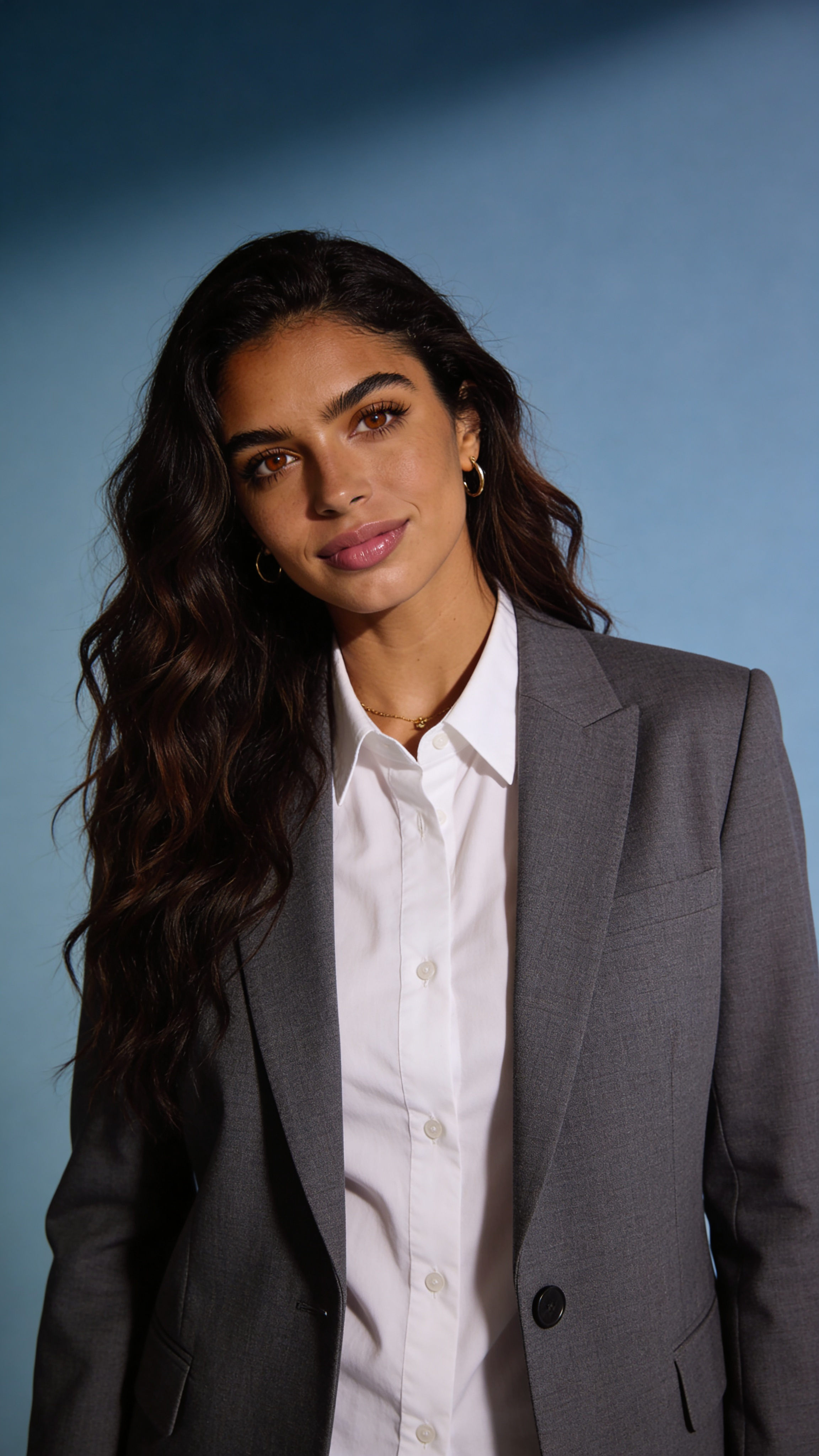 Single photograph of exactly the same person as the reference image(s), consistent identity realistic photograph, female person, 27 years old, brown eyes, dark-brown hair color, wavy hair style, olive skin, medium natural breasts (Cup size D) covered with clothing Hair color must stay dark-brown. Keep hairstyle consistent (wavy). Do not change defining physical features. No wigs. No hats. Face unobscured. Half-body shot. Clean studio portrait with a muted blue-gray background and slightly stronger directional lighting for depth while staying conservative. Subject is half-body, subtle head tilt, calm smile, direct eye contact. Outfit: medium-gray blazer, white shirt, minimal accessories. Composition leaves room for cropping to different resume formats, keeping a natural, authentic look; no text, no watermarks, no logos, no overlays.