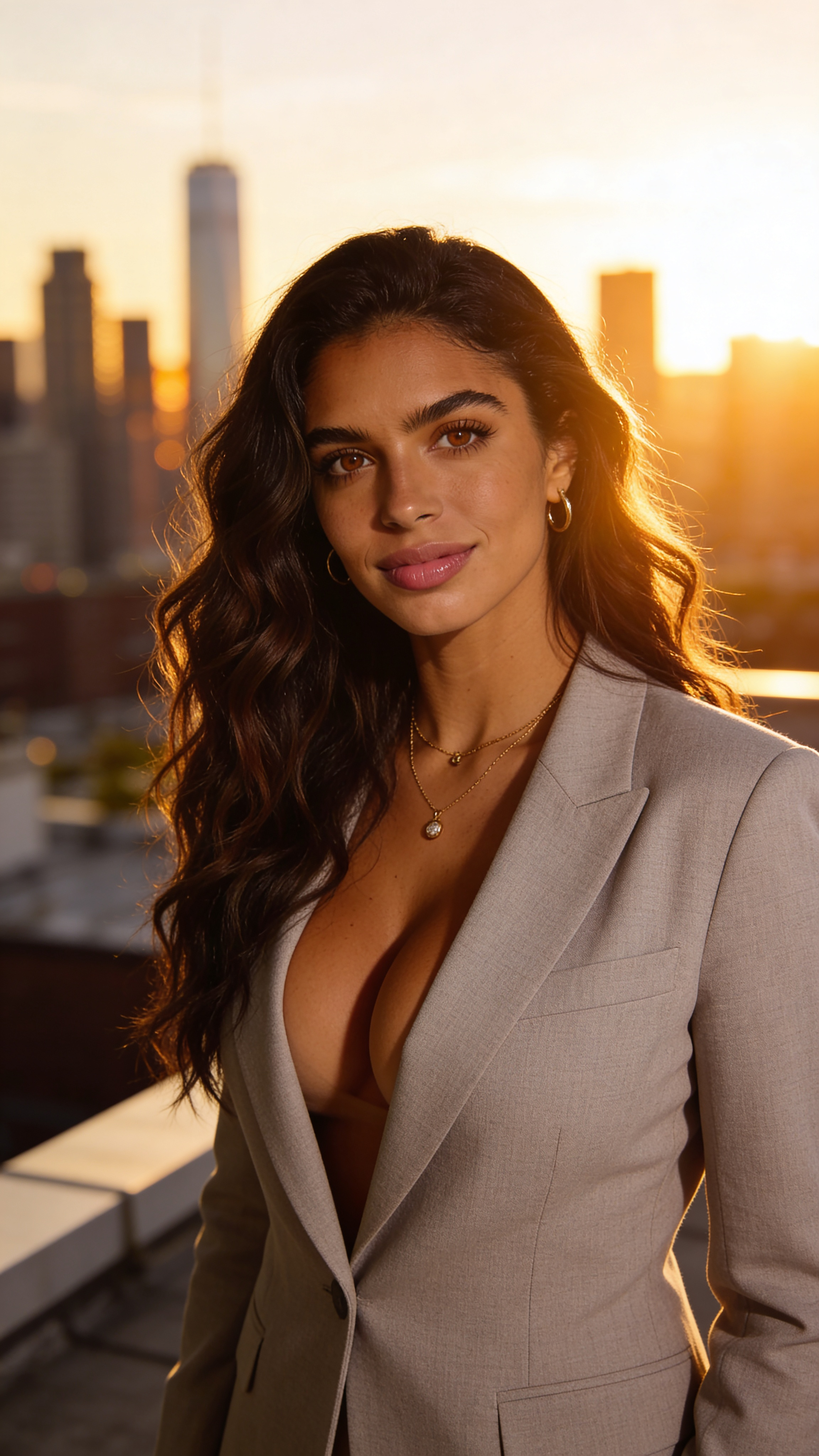 Single photograph of exactly the same person as the reference image(s), consistent identity realistic photograph, female person, 27 years old, brown eyes, dark-brown hair color, wavy hair style, olive skin, medium natural breasts (Cup size D) covered with clothing Hair color must stay dark-brown. Keep hairstyle consistent (wavy). Do not change defining physical features. No wigs. No hats. Face unobscured. Headshot shot. Outdoor golden hour rooftop scene with blurred city skyline bokeh. The same AI character in head-and-shoulders crop, wearing a light-gray blazer, subtle confident smile, slight angle to camera. Warm rim light from sunset, natural skin detail, aspirational professional vibe, no captions or writing, no text, no watermarks, no logos, no overlays